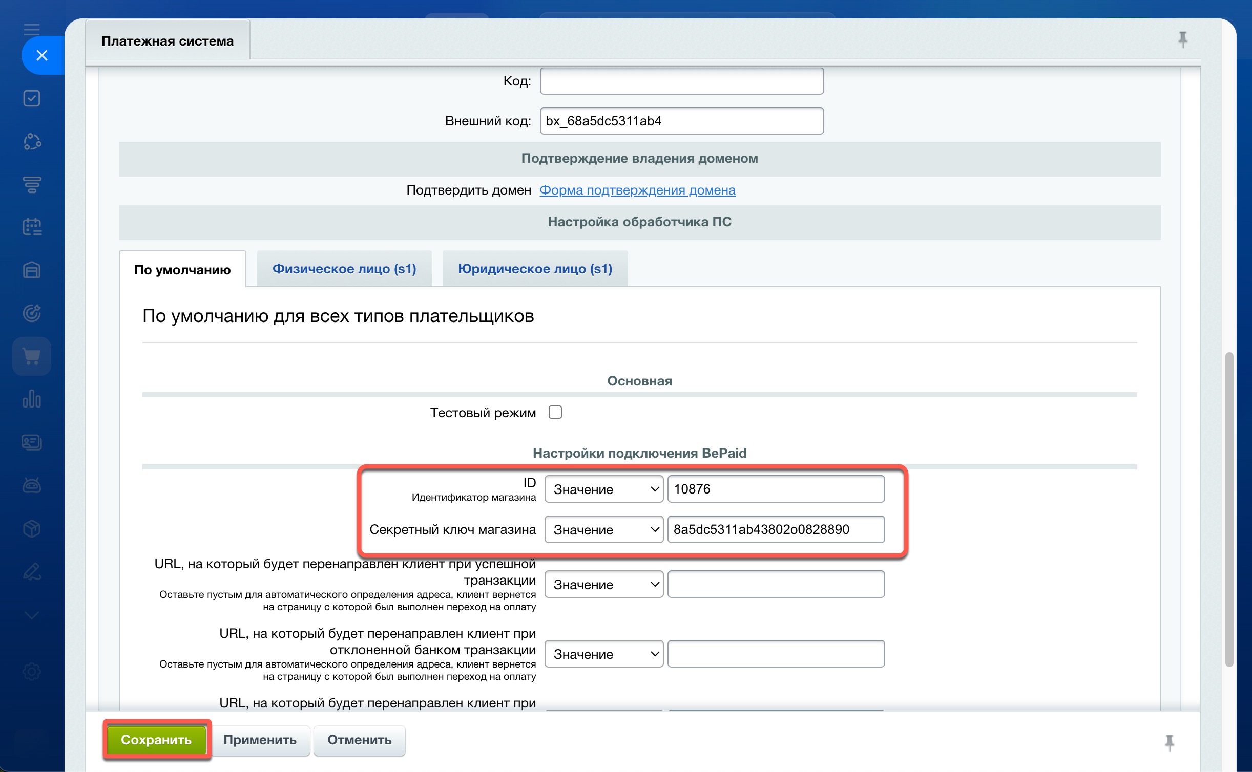 Внизу страницы настроек вставьте ID вашего магазина и секретный ключ, которые вы копировали в личном кабинете bePaid. Сохраните настройки.