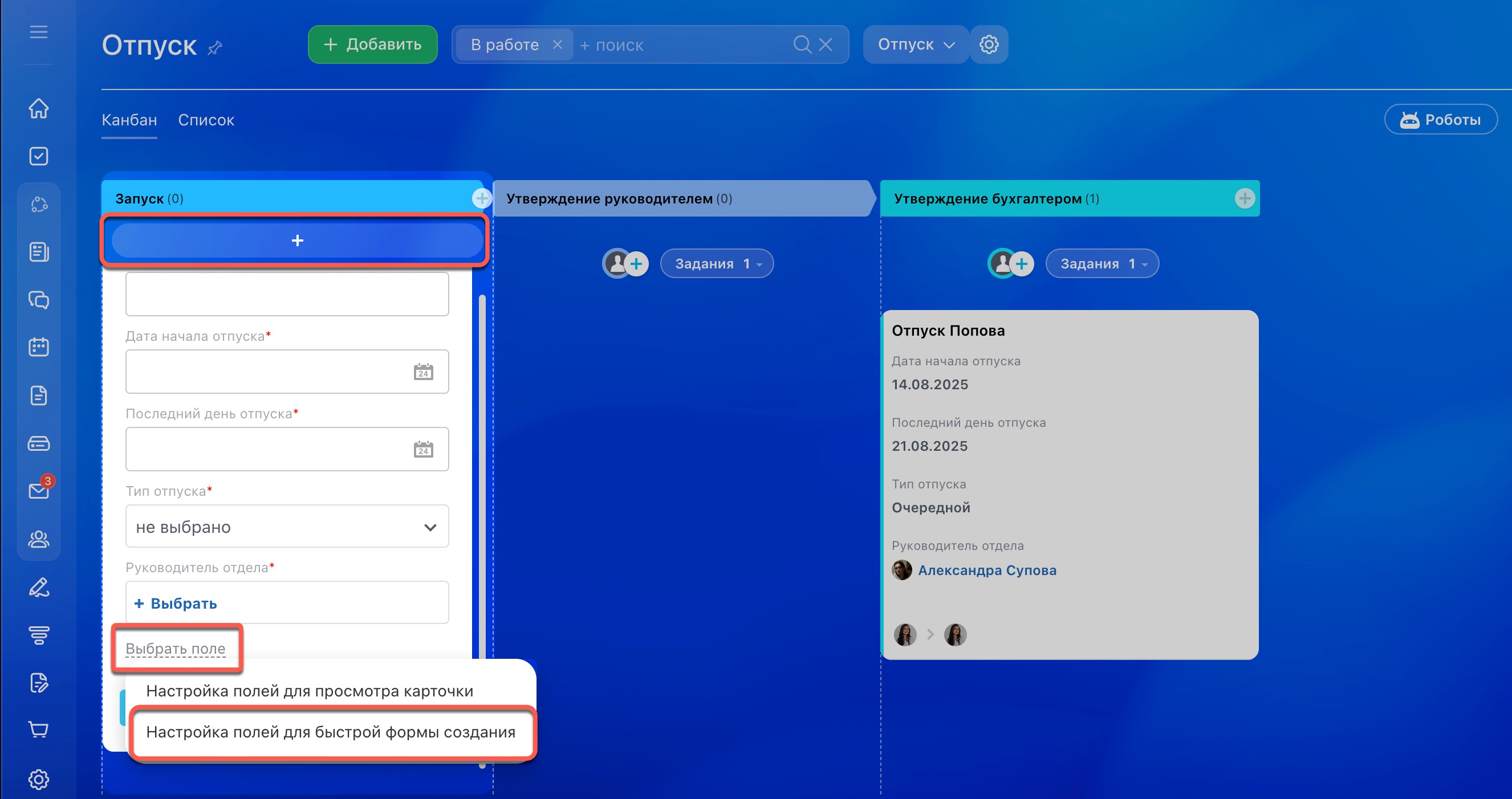 В канбане вы можете настроить, какие поля отображать во время создания элемента и в режиме просмотра. Для этого начните создавать новый элемент и нажмите Выбрать поле.