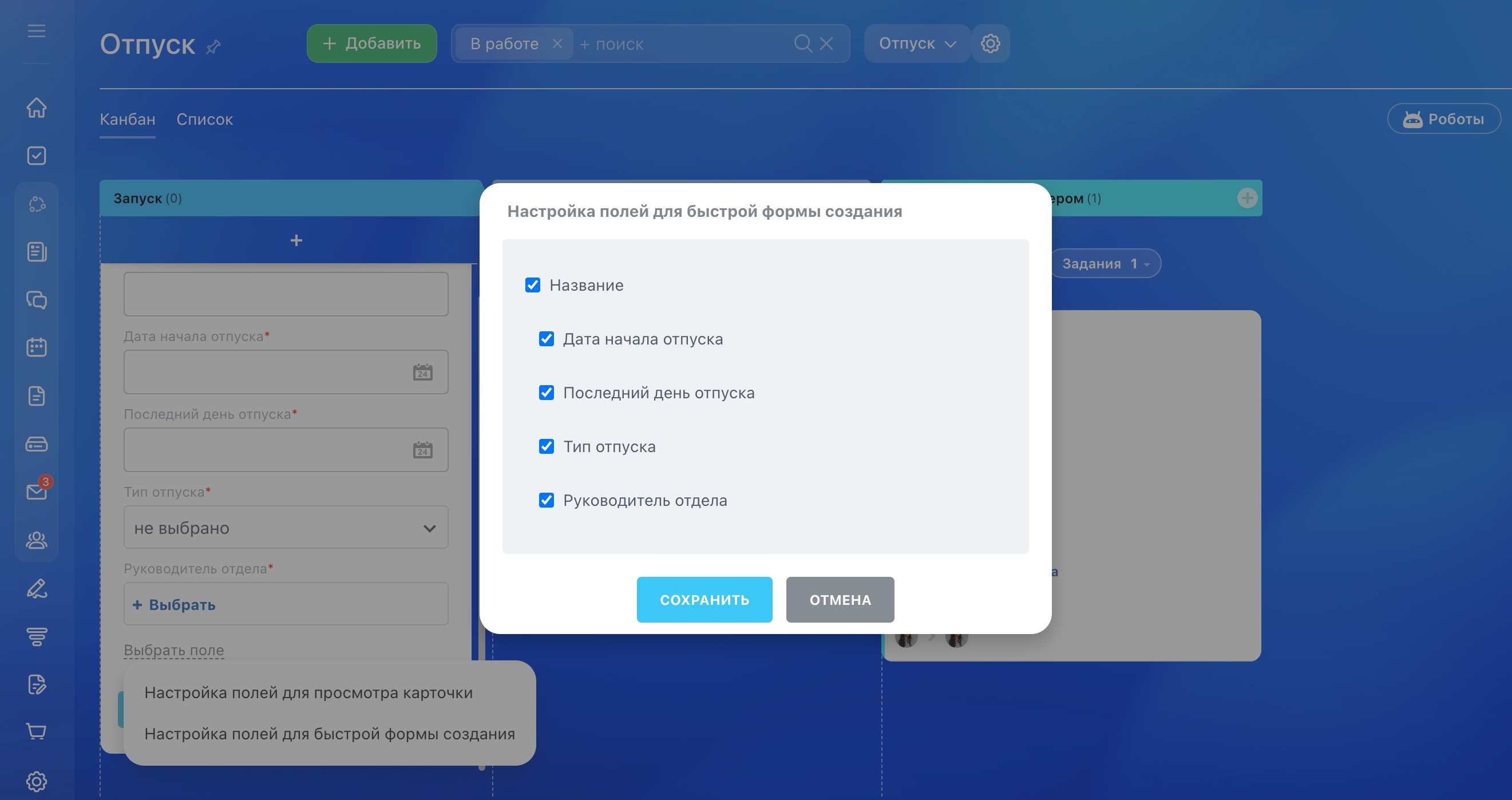 Опция Настройки полей для быстрой формы создания позволяет выбрать поля, которые будут отображаться в момент создания элемента. В этом случае вы можете выбрать только пользовательские поля.
