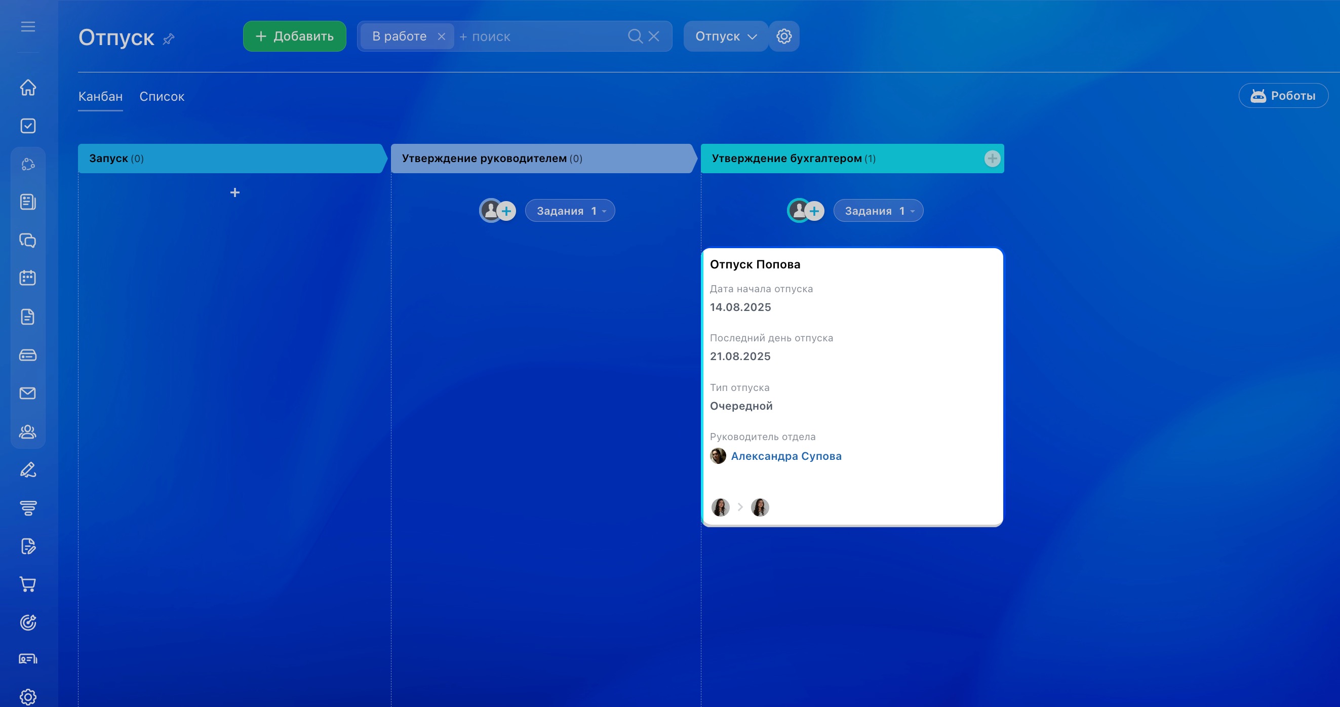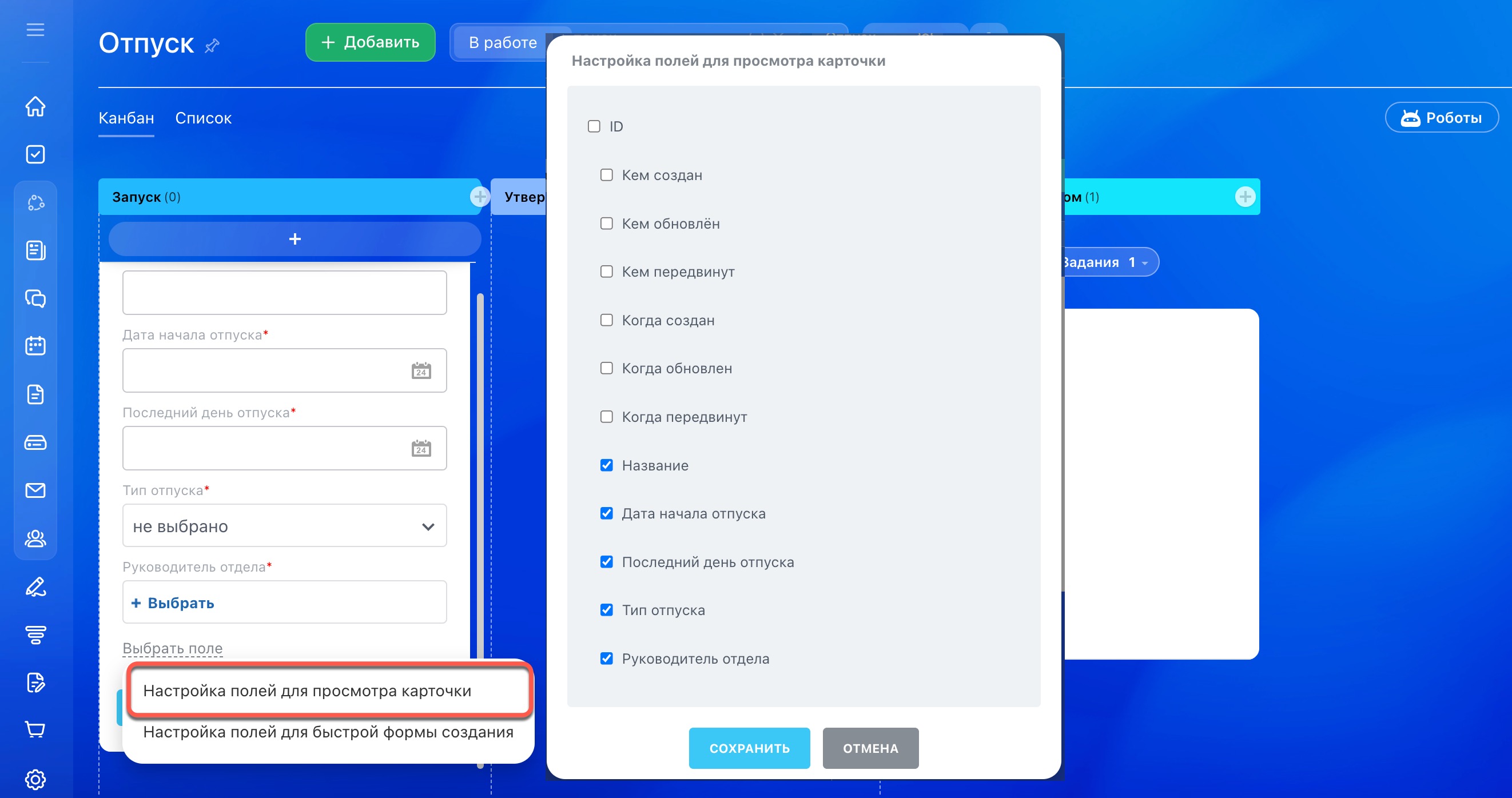 Опция Настройка полей для просмотра карточки необходима, чтобы выбрать поля, которые будут отображаться в канбане. В режиме просмотра можно отображать не только пользовательские поля, но и другие данные, например дату создания, ID или кто создал элемент.