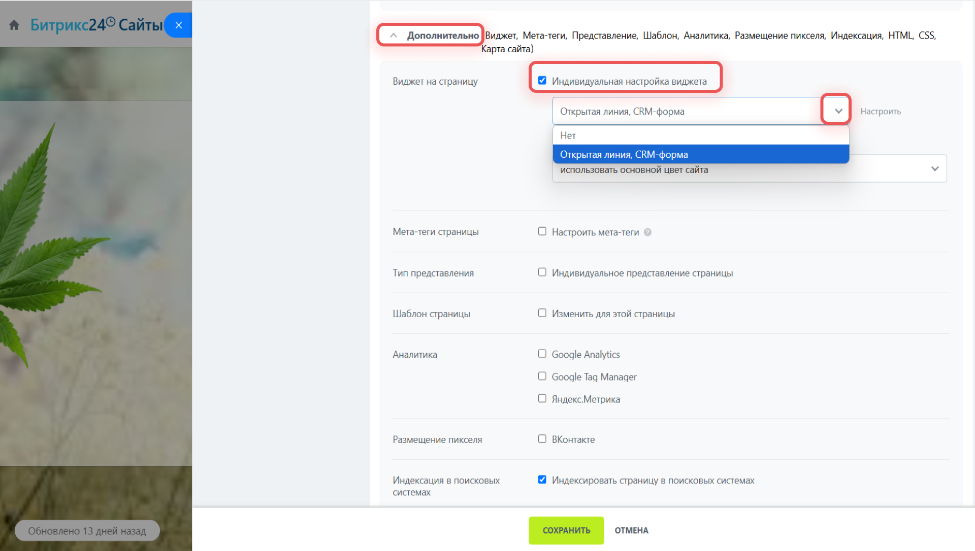 Далее откройте вкладку Дополнительно и активируйте опцию Индивидуальная настройка виджета. Если для этой страницы нужен виджет, который отличается от основного виджета, выберите один из вариантов в списке. А если на странице виджет не нужен, выберите вариант Нет.