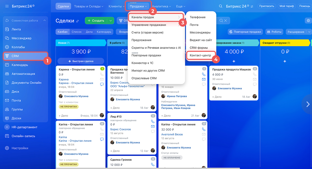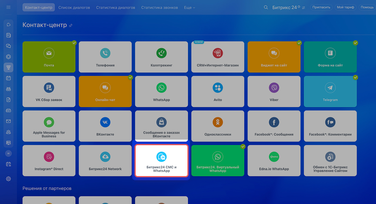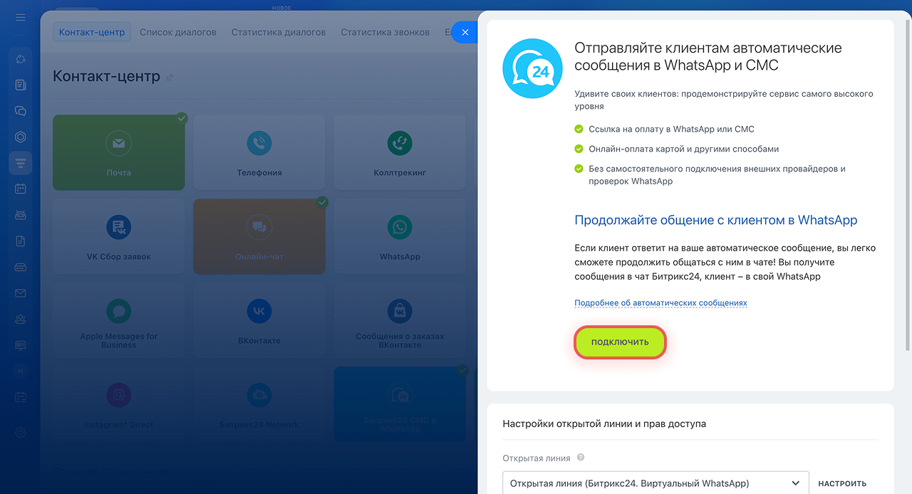 Подключить можно в веб-версии Битрикс24. Для этого перейдите в CRM > Продажи > Каналы продаж > Контакт-центр > Битрикс24 СМС и WhatsApp*.
