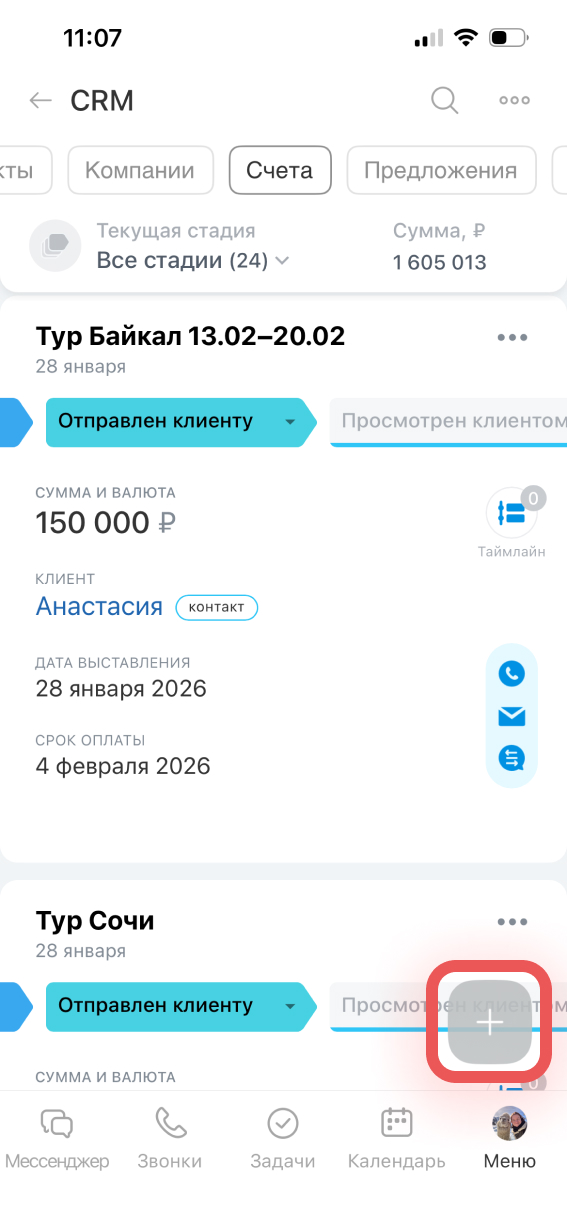 Чтобы создать счет вручную, нажмите Плюс (+).
