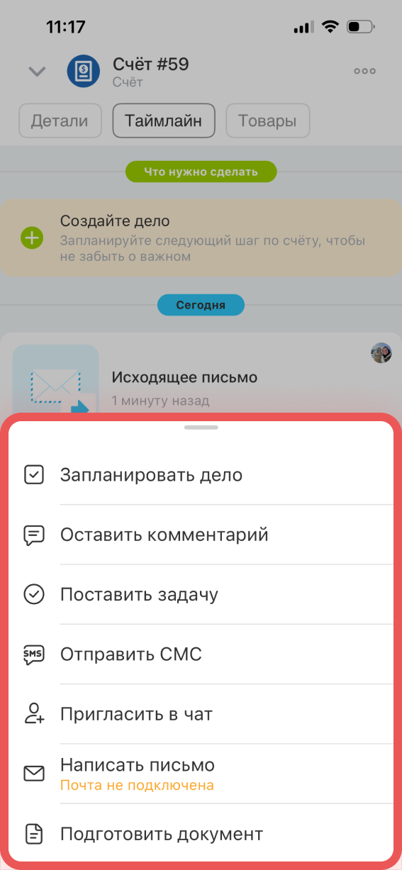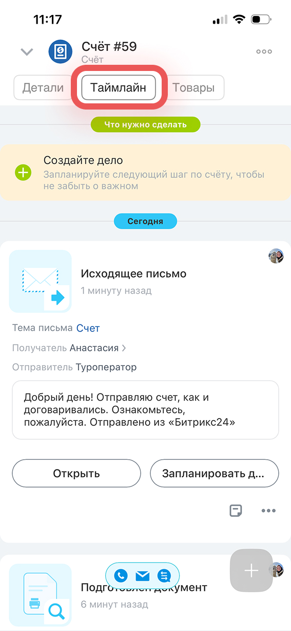 Дело можно создать прямо из таймлайна — нажмите Создайте дело. Дела помогают не забыть о клиенте, например, запланировать звонок или подготовку документов.