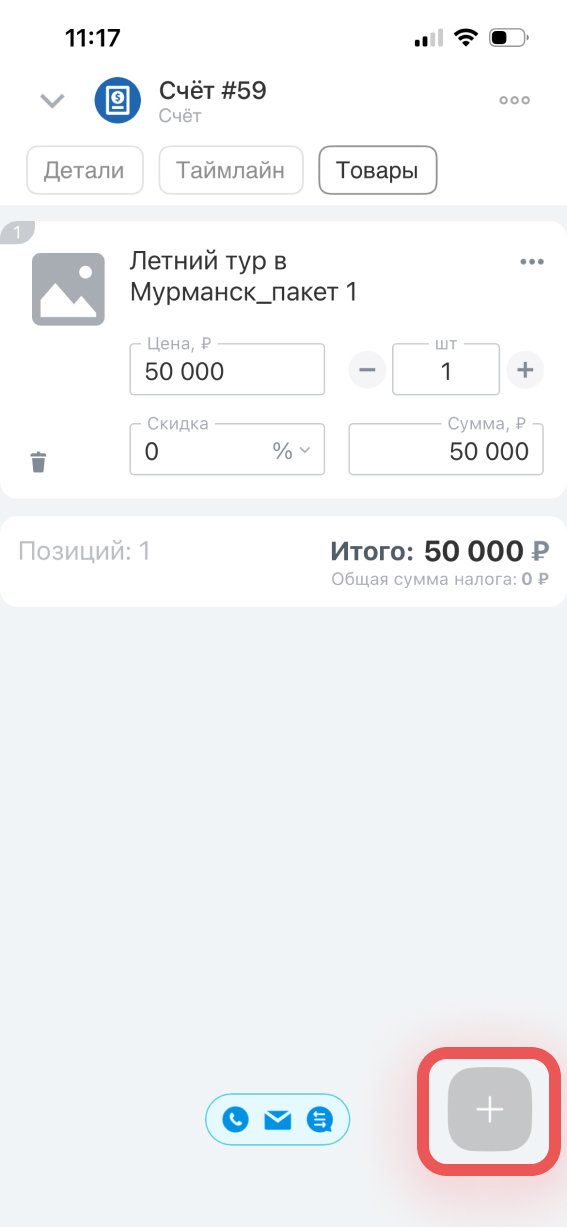 Товары — в этой вкладке можно добавить товар, указать цену, количество и скидку. Товар можно добавить на любом этапе работы с клиентом — для этого нажмите Плюс (+).