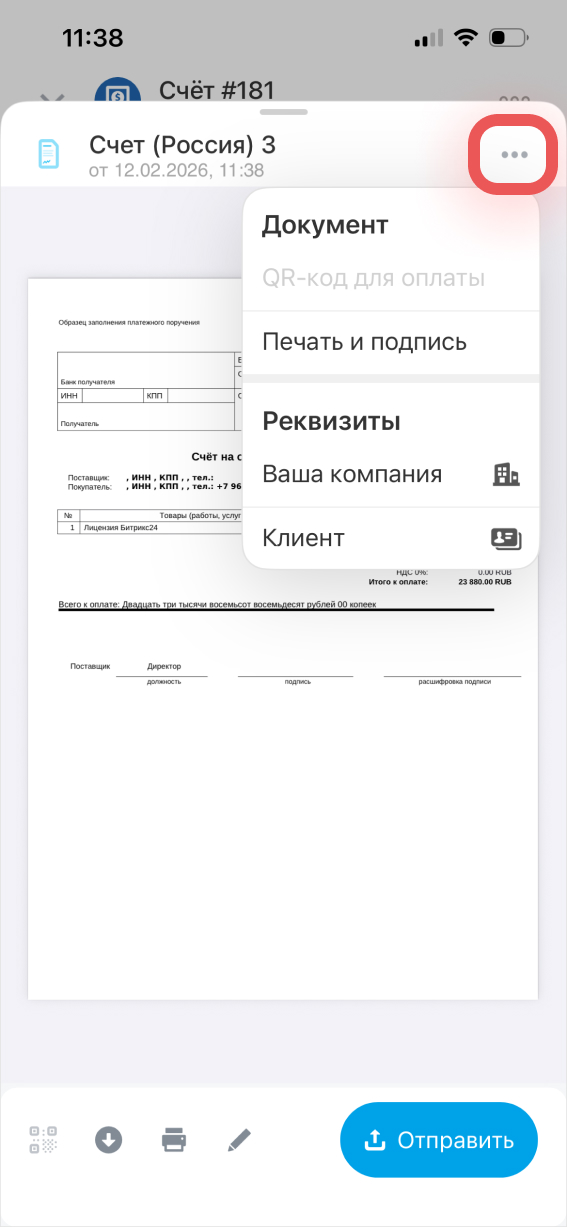 Чтобы отправить документ клиенту, нажмите Отправить.