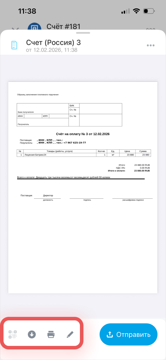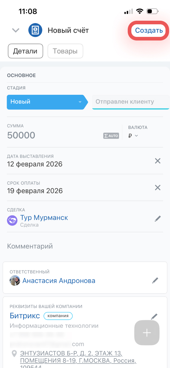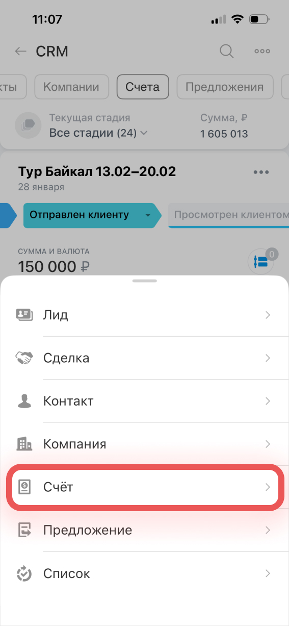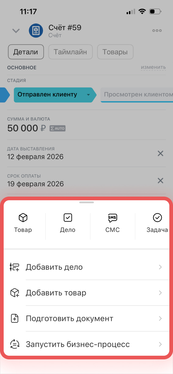 Создать и отправить счет клиенту можно прямо из мобильной CRM — документ заполняется автоматически, без ручного ввода данных.