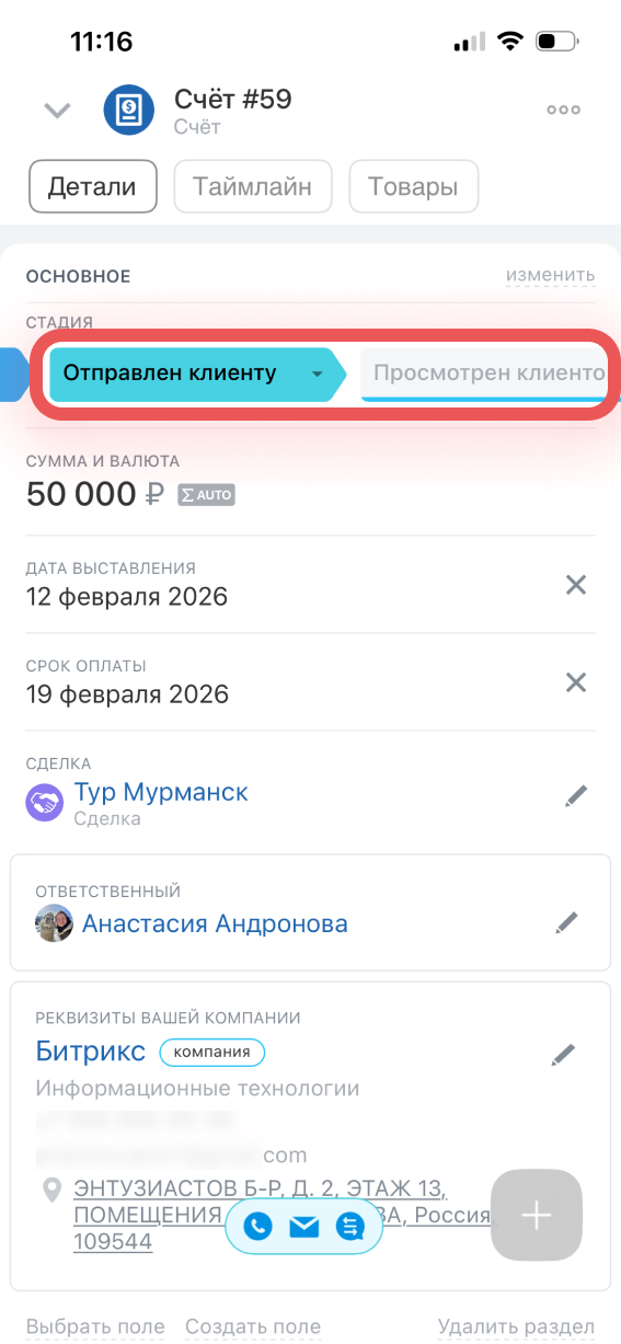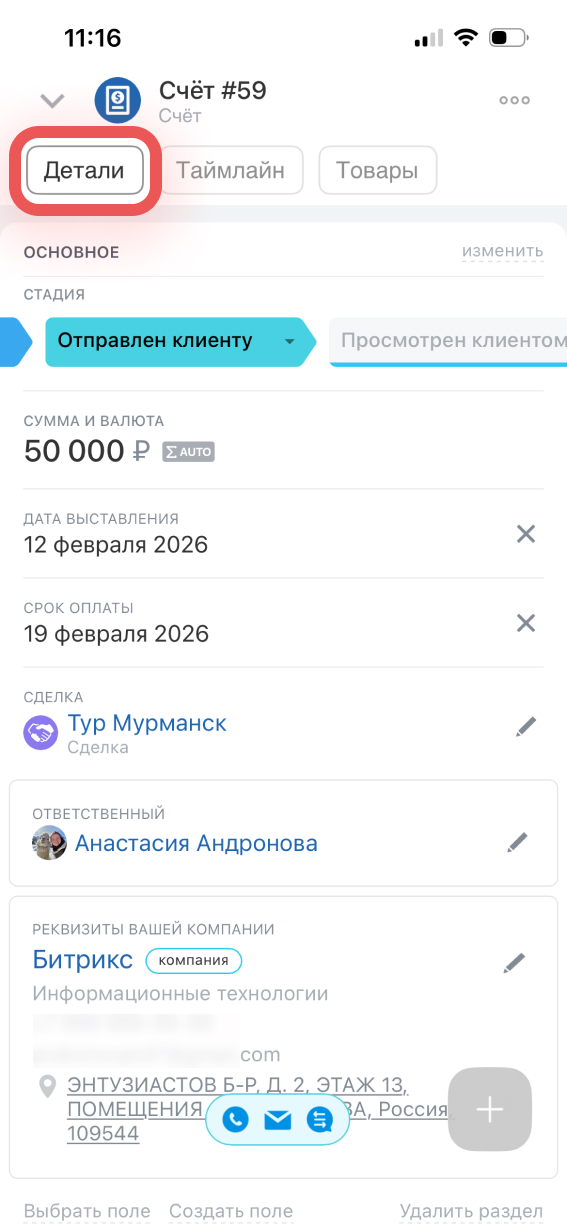 Детали — в этой вкладке можно просмотреть основную информацию о счете, изменить значения полей и стадию.