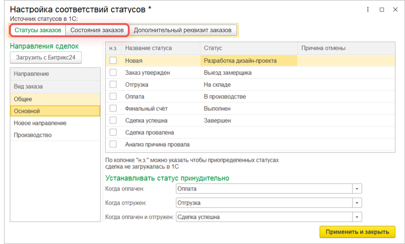 В окне сопоставления статусов есть отдельные вкладки «Статусы заказов» и «Состояние заказов». Они настраивают связь стадий сделок Битрикс24 с состояниями и статусами заказов в 1С. Вы можете задать сопоставление либо по состояниям заказов, либо по статусам — в зависимости от того, какой реквизит используется в вашей конфигурации. Работать будет то сопоставление, которое вы изменили последним и сохранили.