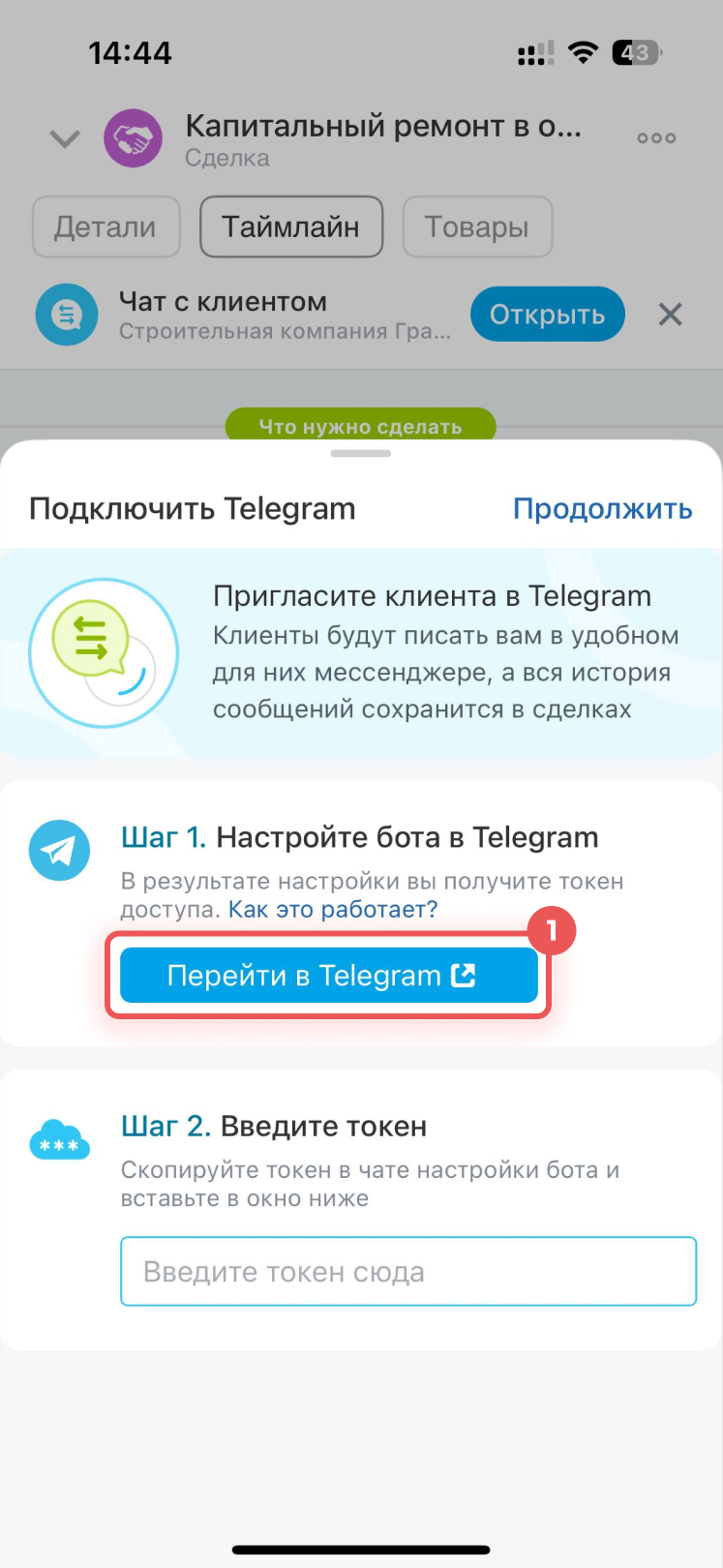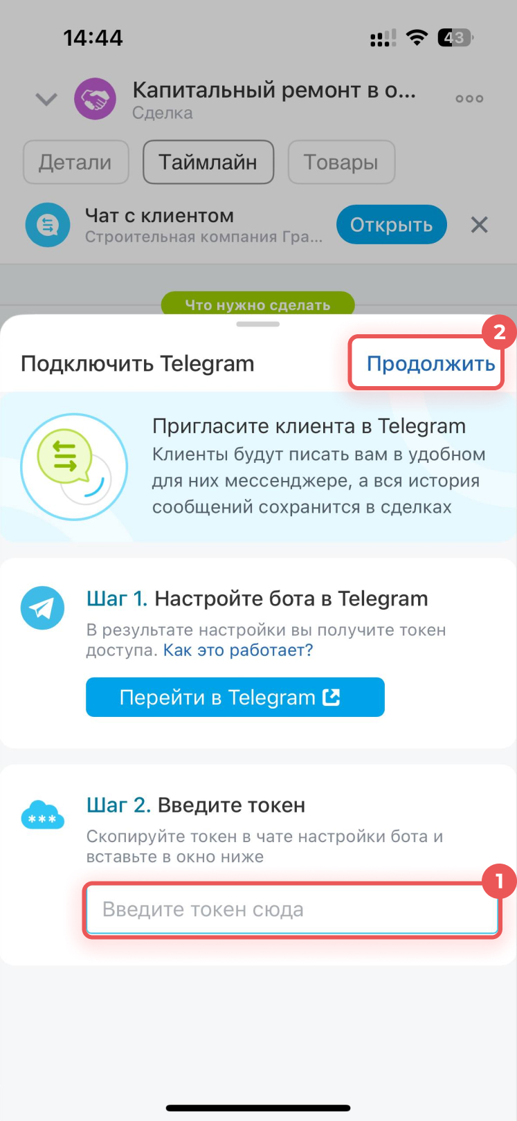 1–2. Вставьте токен в поле Шаг 2 и нажмите Продолжить. Telegram подключится к последней созданной открытой линии. Выбрать другую вы можете в Битрикс24 на компьютере.