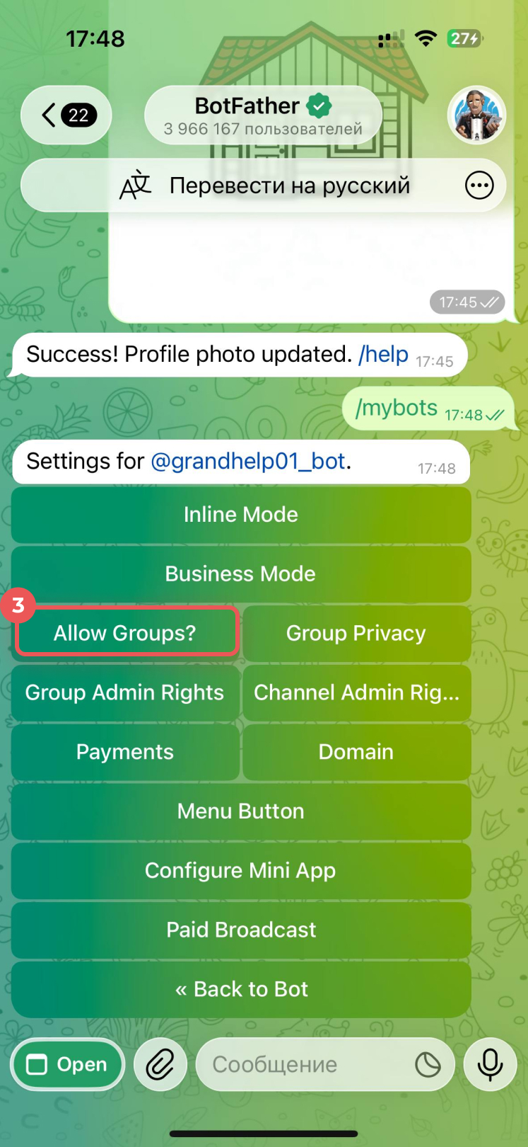 5. Нажмите Turn groups off. Теперь бота нельзя будет добавить в группы.