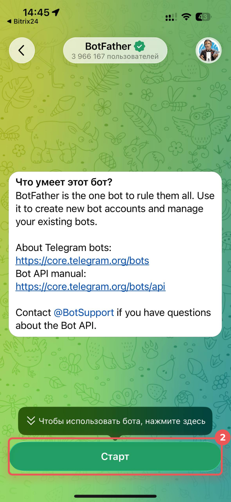 2. Откроется приложение Telegram и чат с ботом @BotFather, который создает ботов и выдает токены. Нажмите Старт.