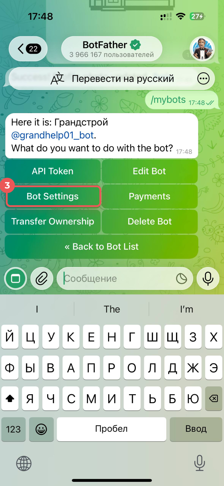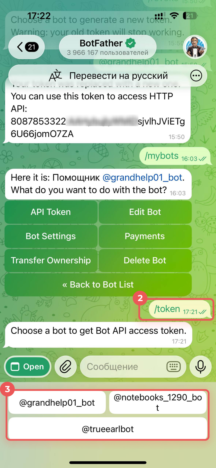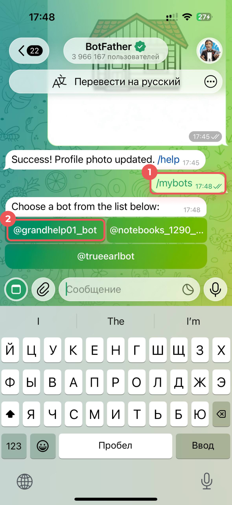 1–2. Введите команду /mybots и выберите бота.