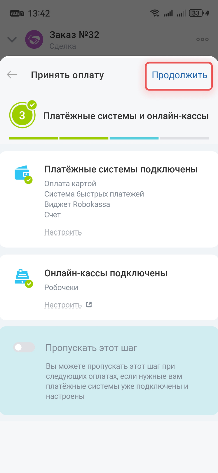 Подключите платежную систему и онлайн-кассу. Нажмите Продолжить, если подключили все ранее.