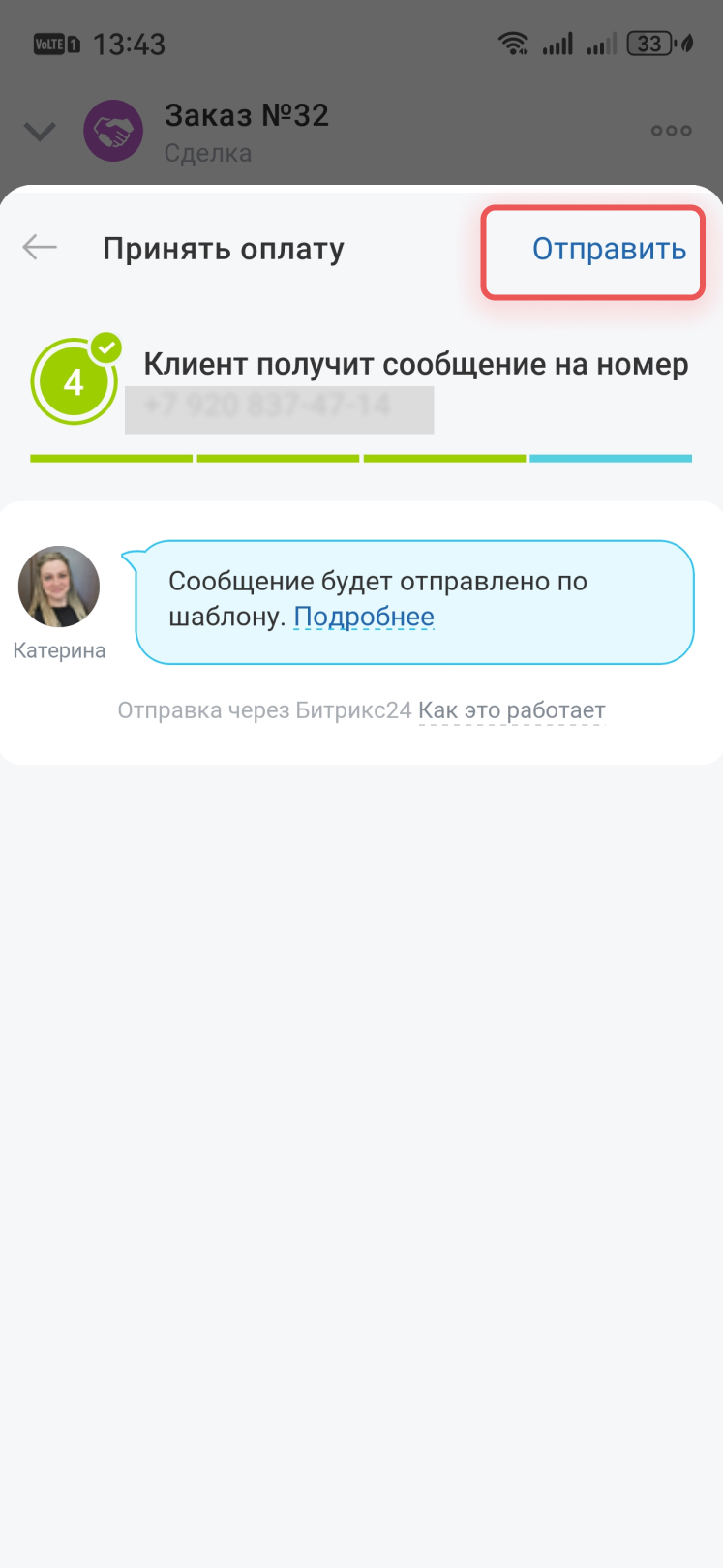 Нажмите Отправить и клиент получит СМС со ссылкой на оплату.