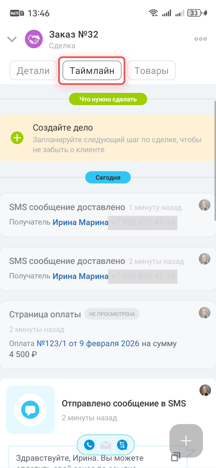 Вся информация об СМС и оплате будет в таймлайне сделки.