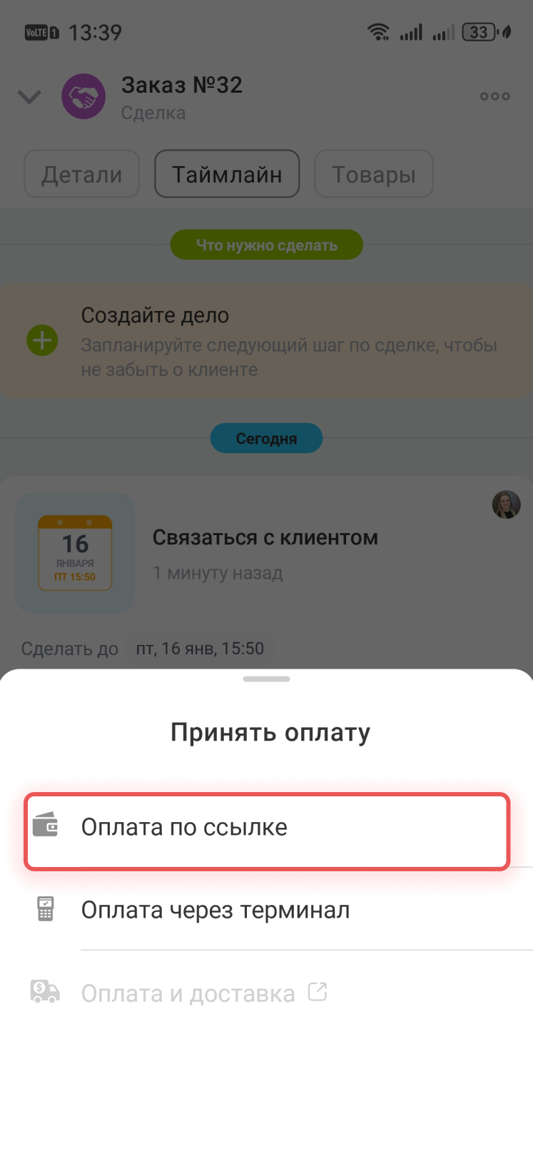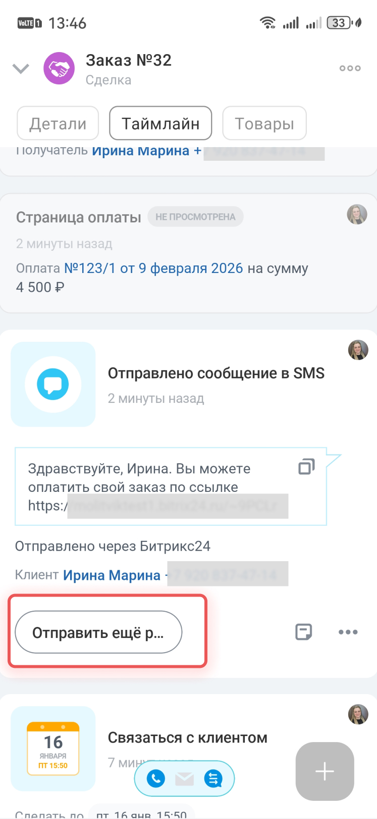 Если клиент не получил ссылку, нажмите в сообщении в таймлане сделки Отправить еще раз.