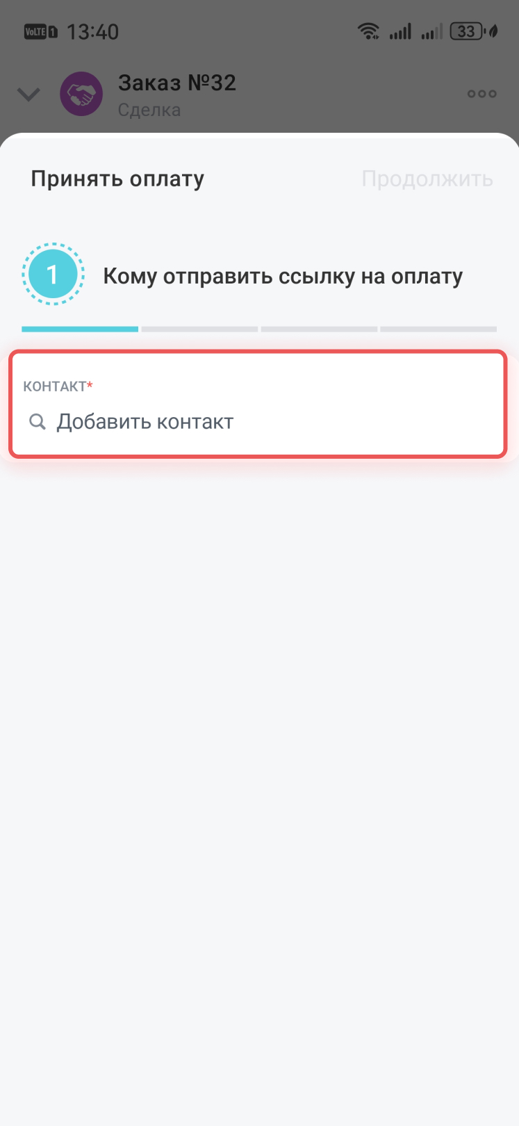 Нажмите Добавить контакт и выберите клиента, которому придет ссылка на оплату.