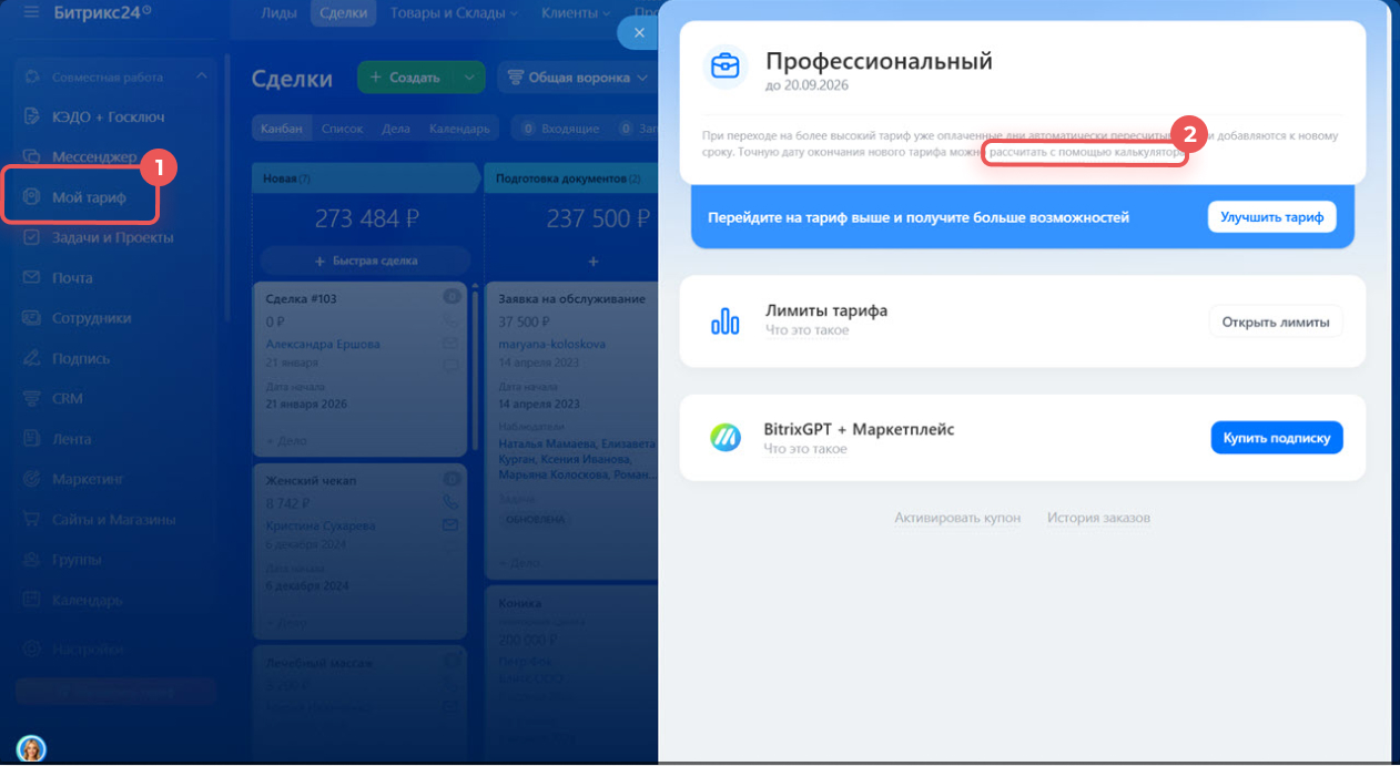 В Битрикс24 появился удобный инструмент — калькулятор добавленных дней при смене тарифа. Раньше, если вы меняли тариф, нужно было обращаться в поддержку, чтобы узнать, сколько оплаченных дней осталось. Сейчас можно быстро подсчитать это на калькуляторе.