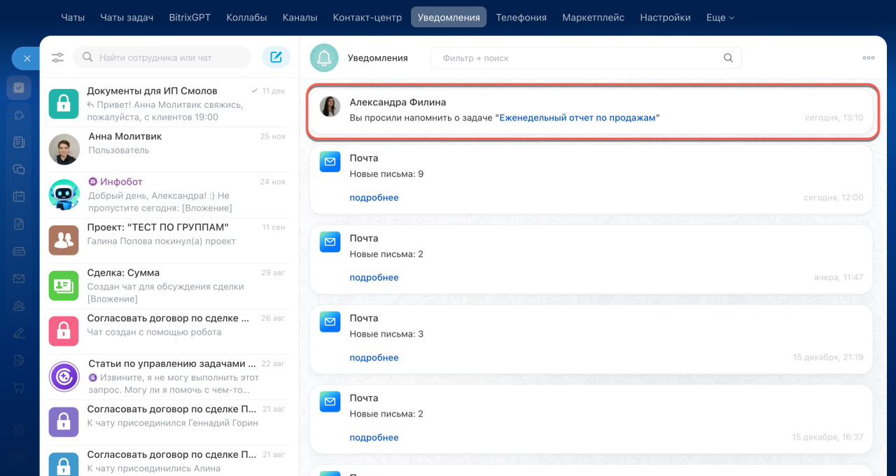 Напоминания. Настраивайте напоминания о задачах в виде уведомлений в Битрикс24 или сообщений на e-mail. Так вы сможете вовремя выполнять задачи и соблюдать дедлайны. Любой участник может добавить напоминание себе или коллегам — исполнителю, постановщику или соисполнителю. Это можно сделать при создании и редактировании задачи.