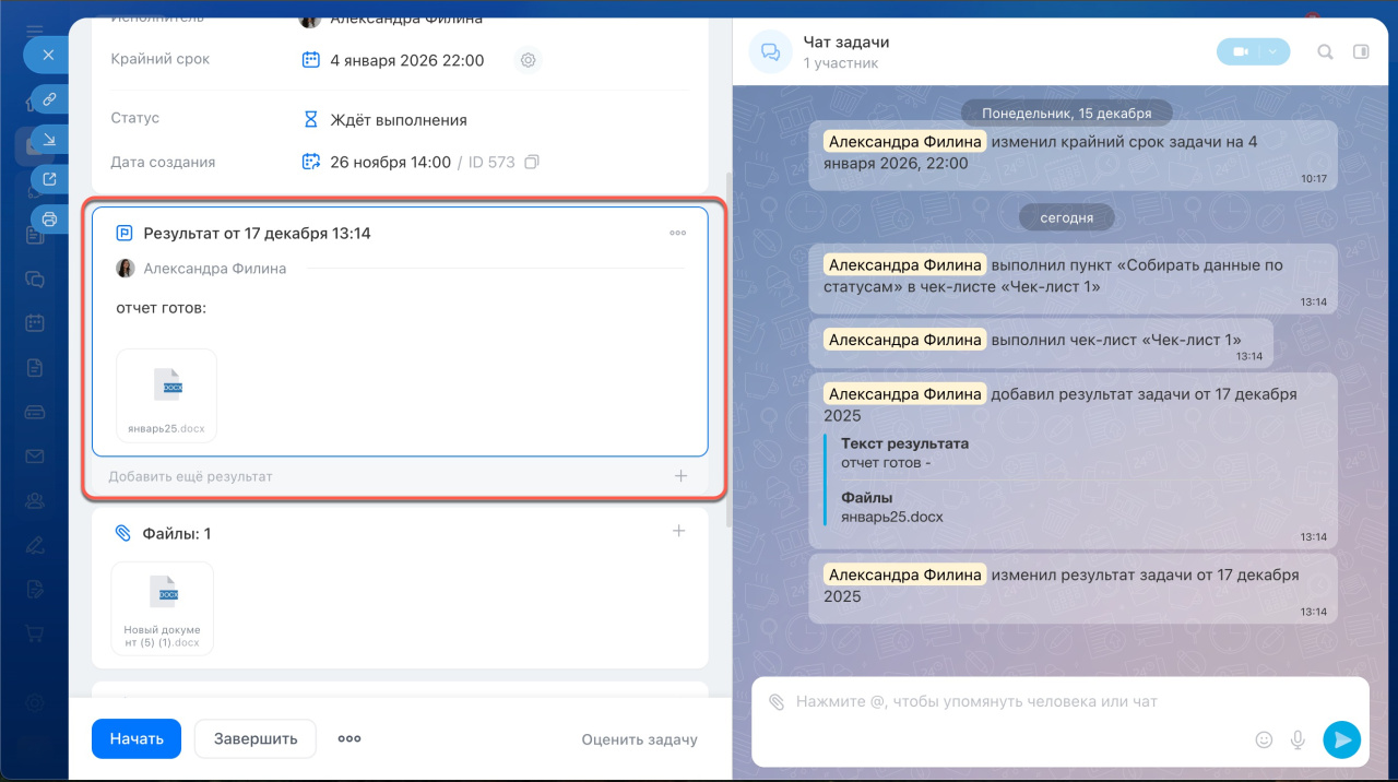 Результат задачи. Отмечайте итог работы, чтобы руководитель не искал его в переписке. Для этого добавьте отчет в раздел «Требуется результат» или отправьте сообщение в чат задаче и отметьте его как результат.