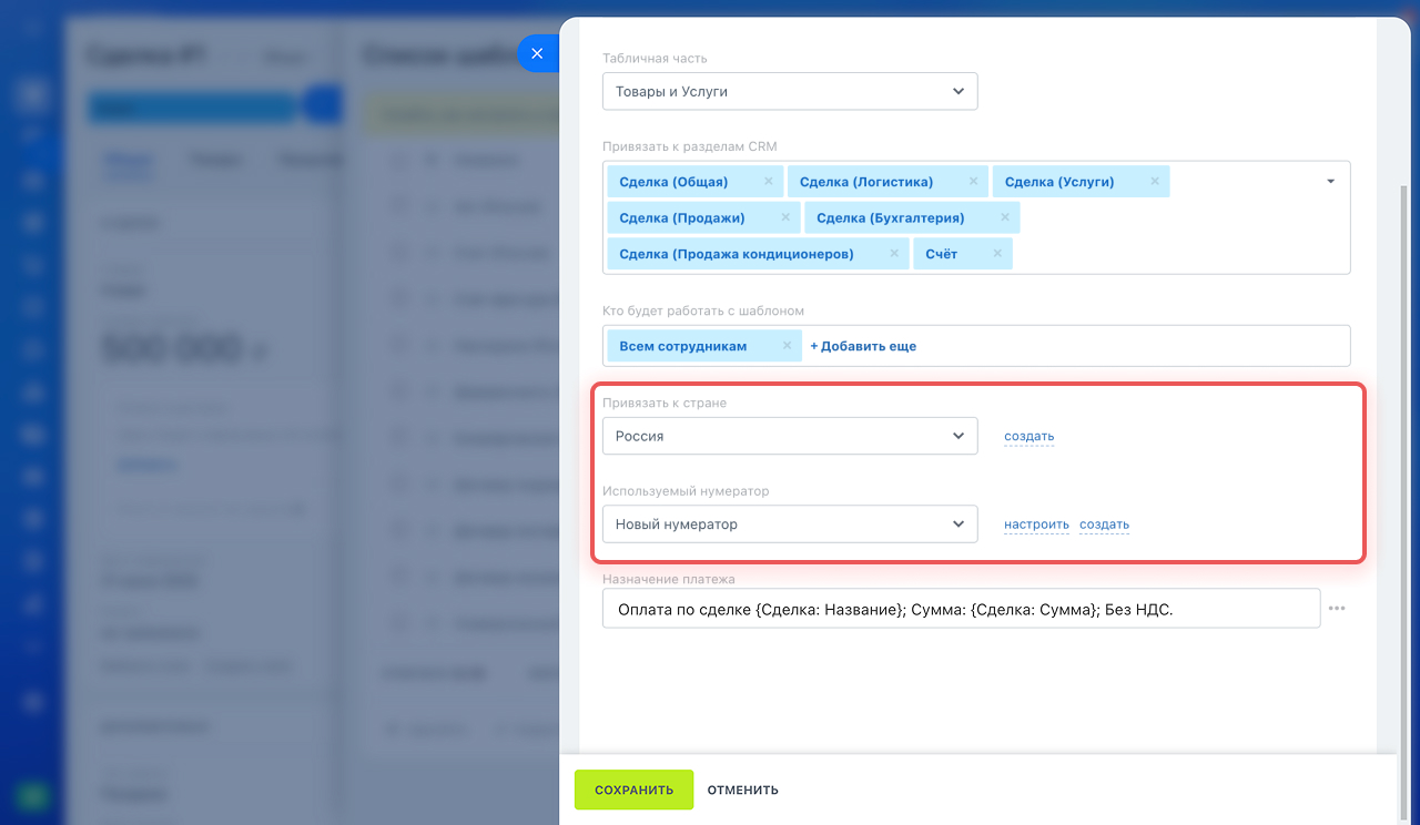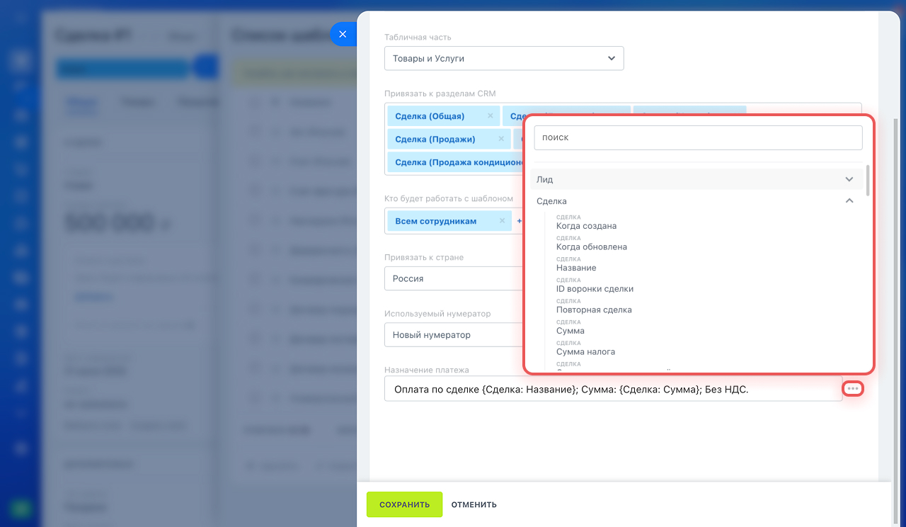 Теперь вы можете использовать этот шаблон, чтобы создать счет из карточки сделки.