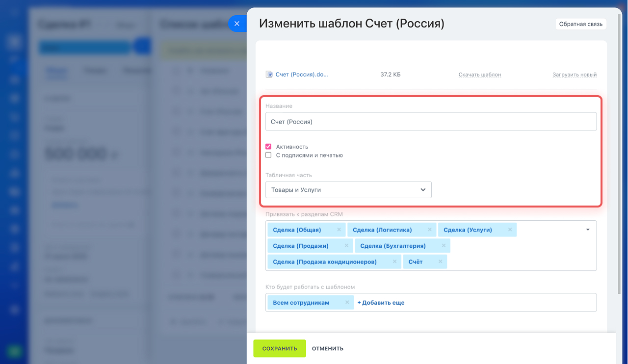 - В настройках шаблона вы можете: изменить название, деактивировать его, указать, кто из сотрудников будет работать с шаблоном, а также из каких элементов CRM можно будет создавать документ на базе этого шаблона.