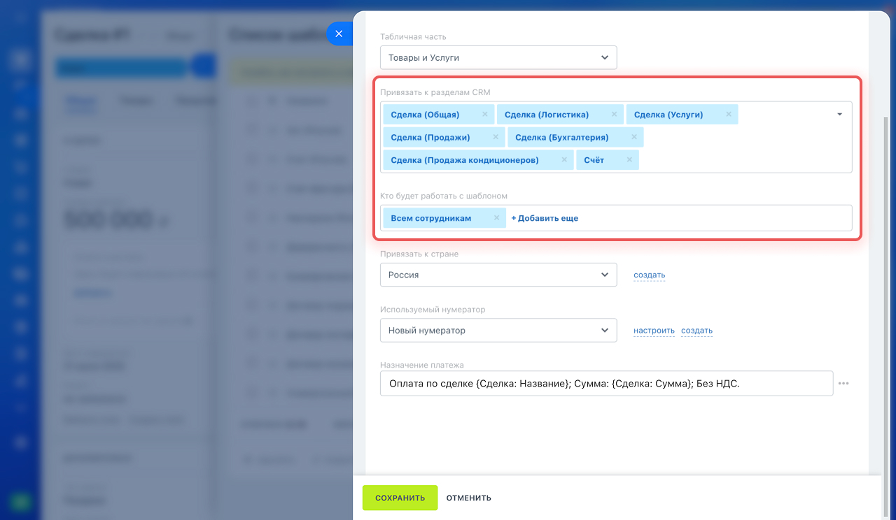 Привязка к разделам CRM. Если у вас два разных бизнеса и две воронки продаж, то вам нужны разные шаблоны. Когда будете создавать шаблон, в пункте Привязка к разделам CRM выберите к какой воронке он будет привязан. Так вы сможете создать абсолютно разные счета для каждого бизнеса и сотрудники не увидят шаблоны, которые не относятся к их воронке.