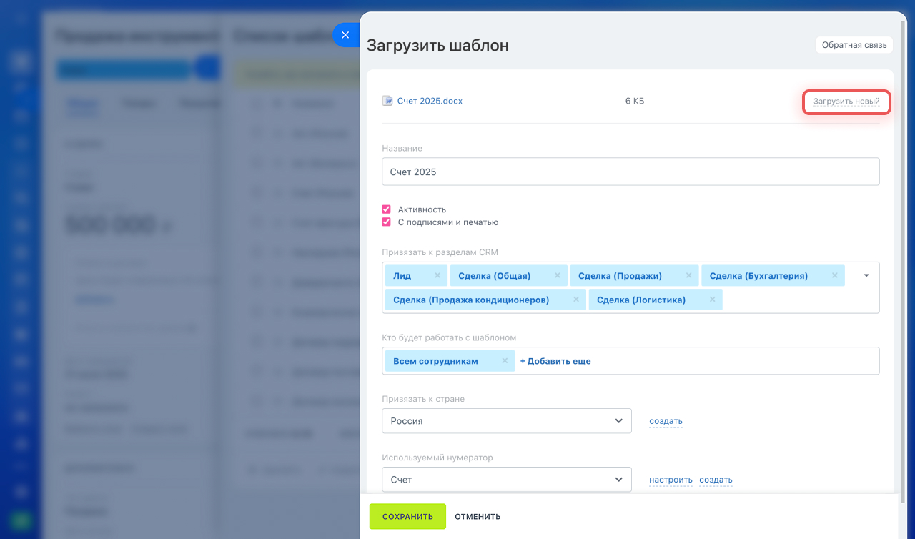 Подробнее про настройки шаблонаПроверьте, правильно ли настроен шаблон. Нажмите на нужный шаблон во вкладке Документ. Сразу откроется документ, который CRM создала на основе вашего шаблона.