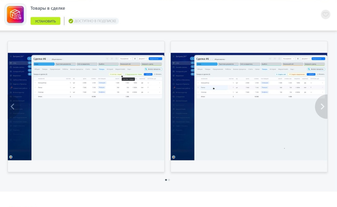 Профессиональное расширение для CRM Битрикс24, предназначенное для удобной и быстрой работы с товарами в Сделках, Лидах и Смарт-процессах. Приложение дополняет стандартный функционал CRM и позволяет управлять товарными позициями в одном интерфейсе без ограничений типового блока товаров.