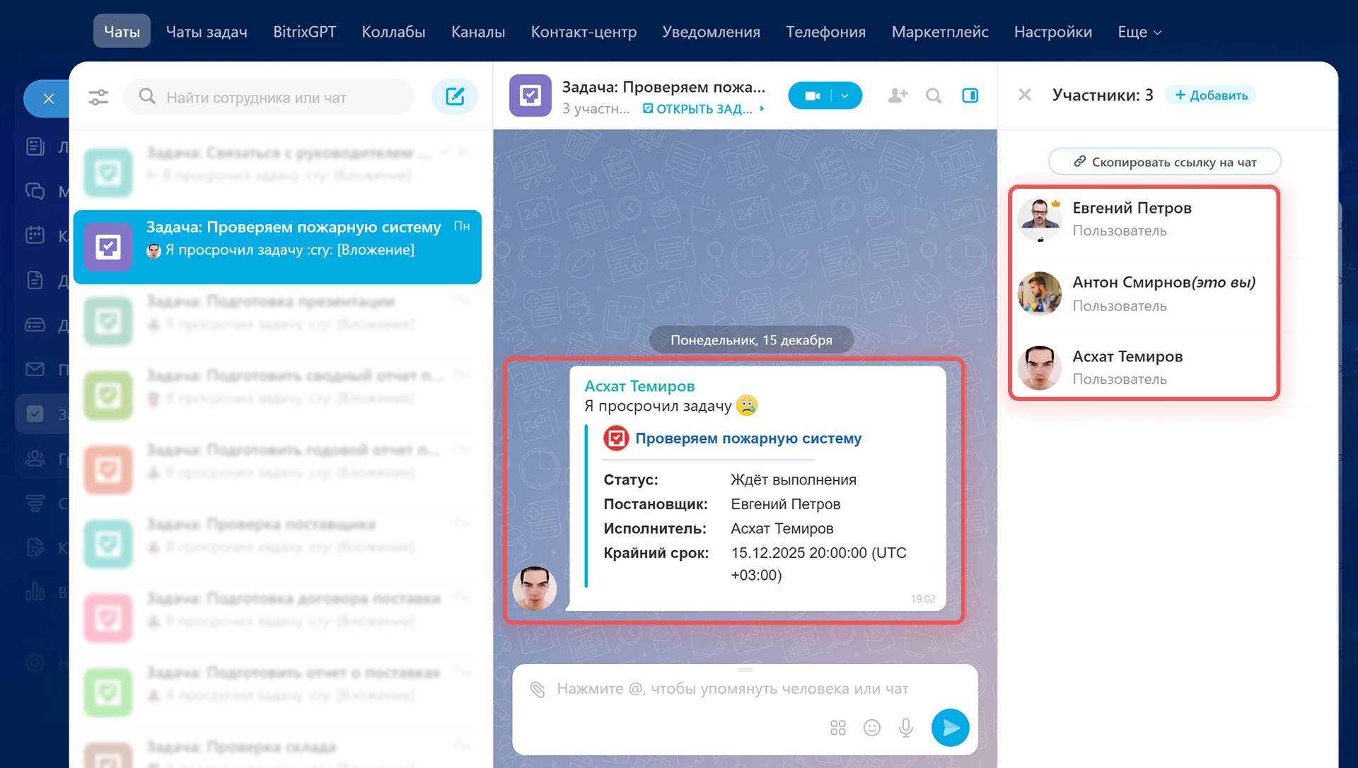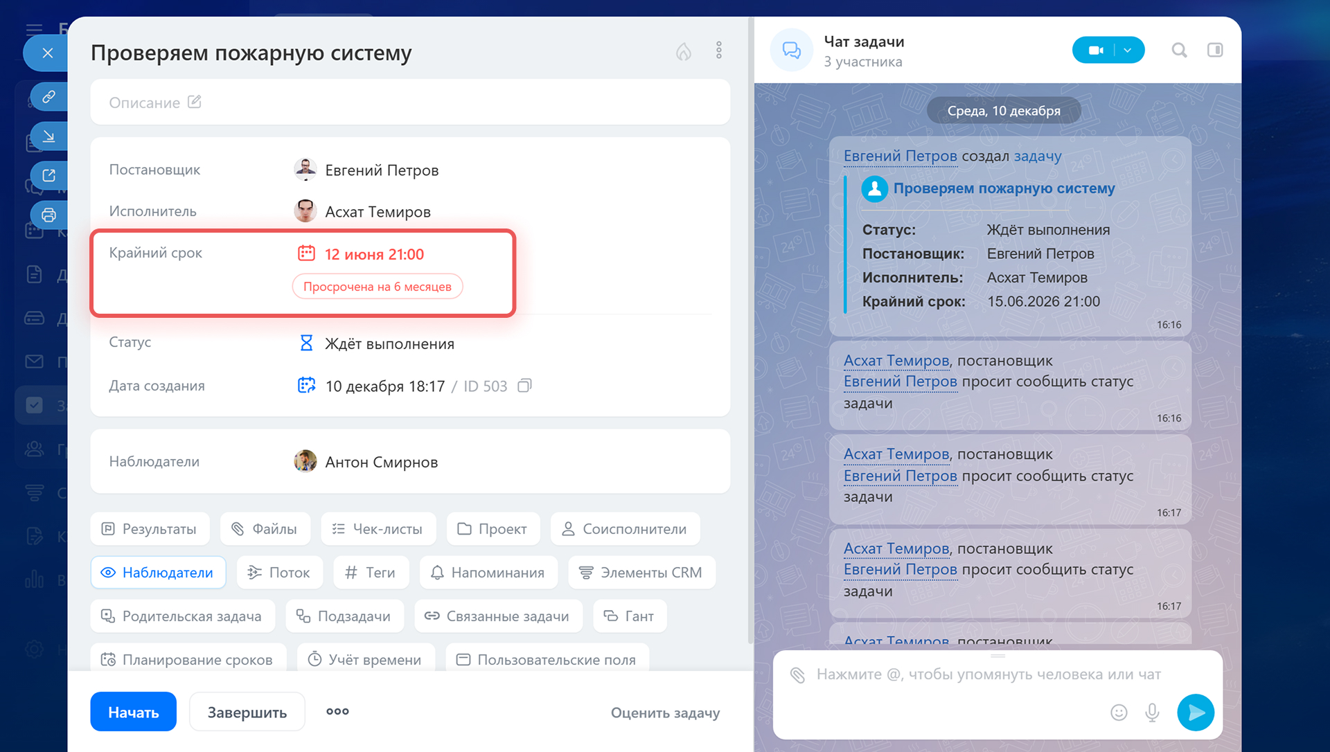 Используйте чат для обсуждения работы над задачей: уточните причины, по которым задача не была выполнена вовремя, назначьте новый крайний срок, делегируйте задачу или измените состав участников.