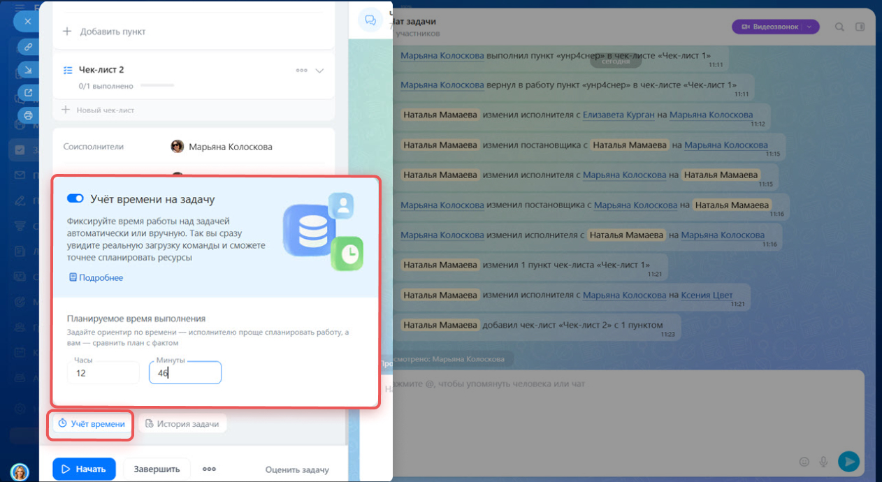 Затраченное время учитывается по тем задачам, в которых включена опция Учет времени.