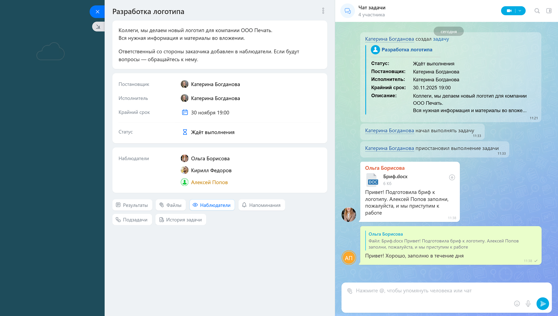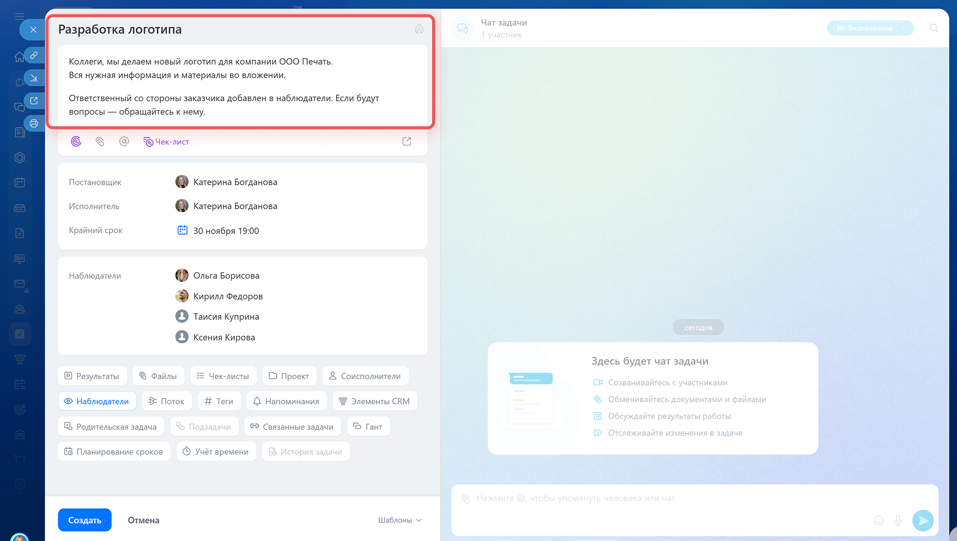 Внешний пользователь сможет отслеживать каждый шаг задачи и оставлять сообщения в чате. При каждом изменении в задаче он будет получать уведомление на почту.