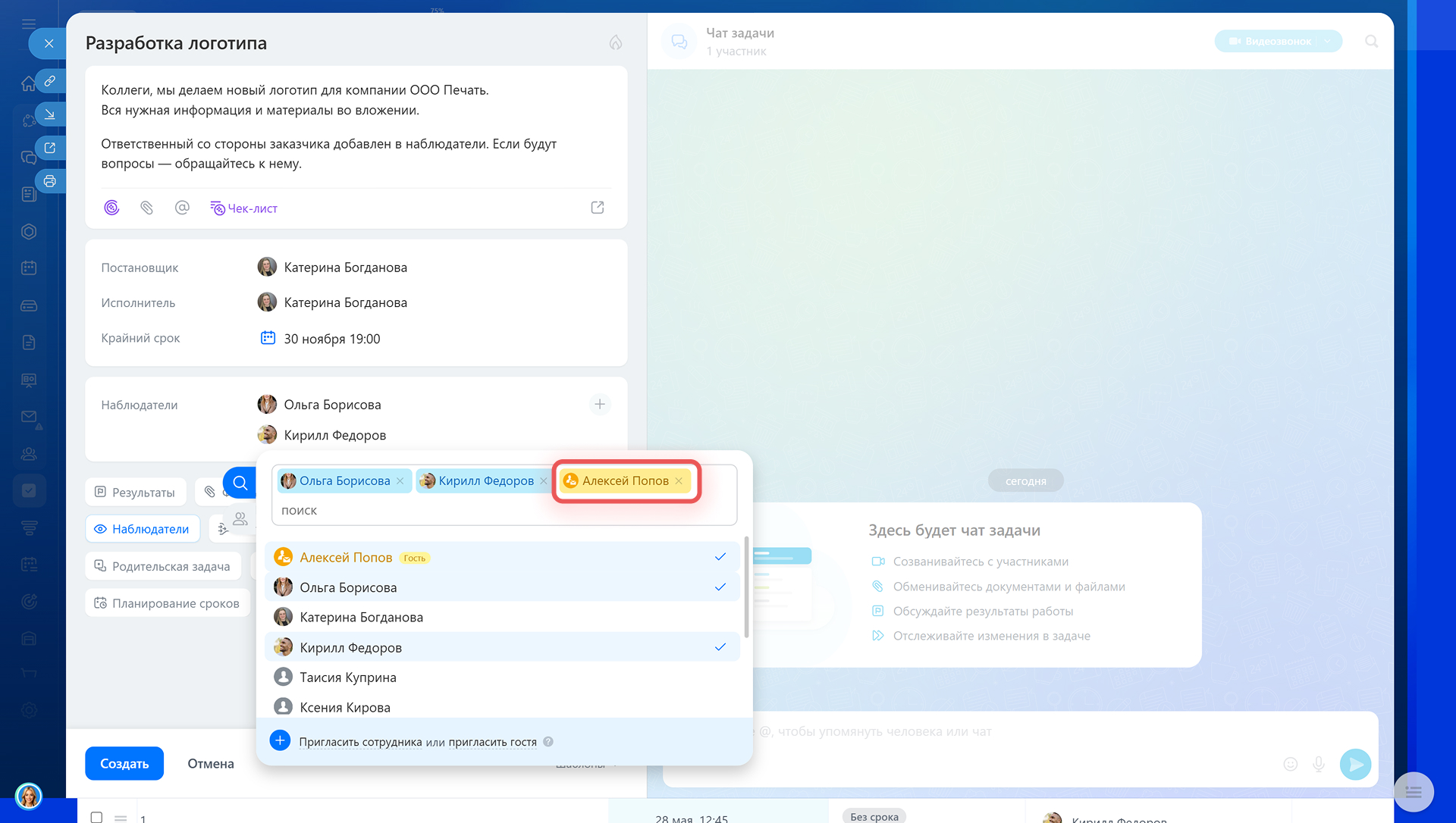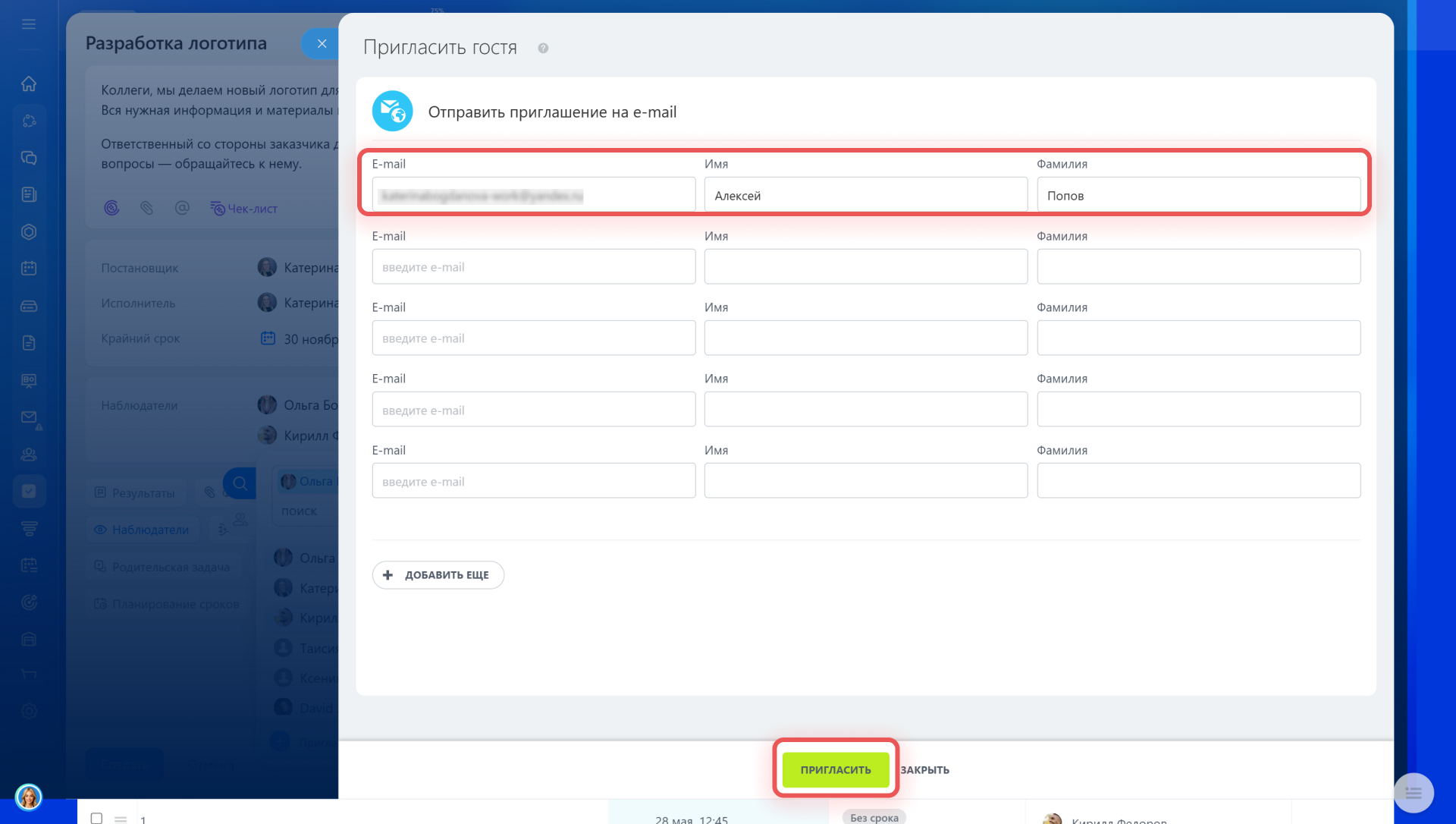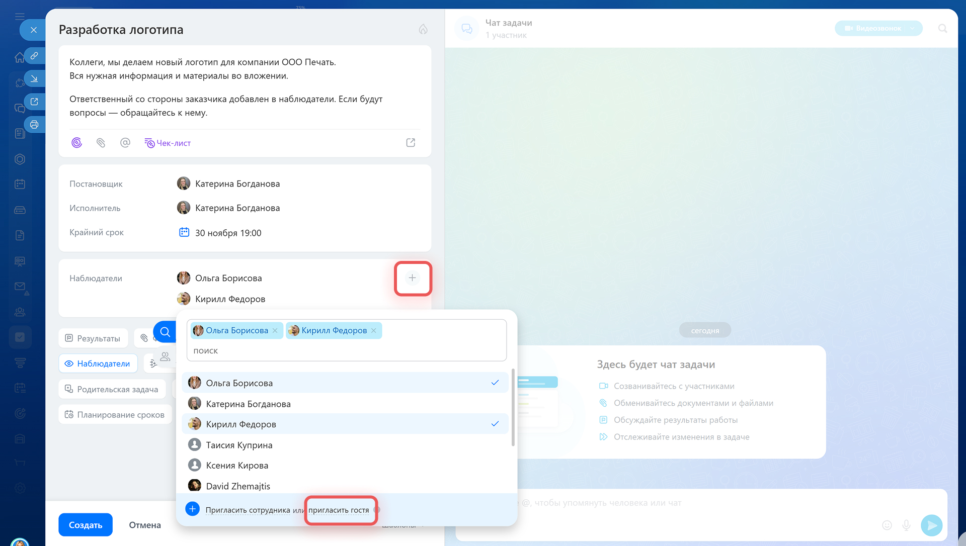 Внешний пользователь может быть как ответственным за задачу, так соисполнителем или наблюдателем. Определите его роль и в нужном поле нажмите Добавить (➕) > Пригласить гостя.
