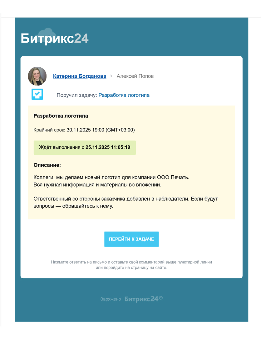 Как только внешнему пользователю придет письмо, он сможет ознакомиться с задачей и перейти в ее полную форму.