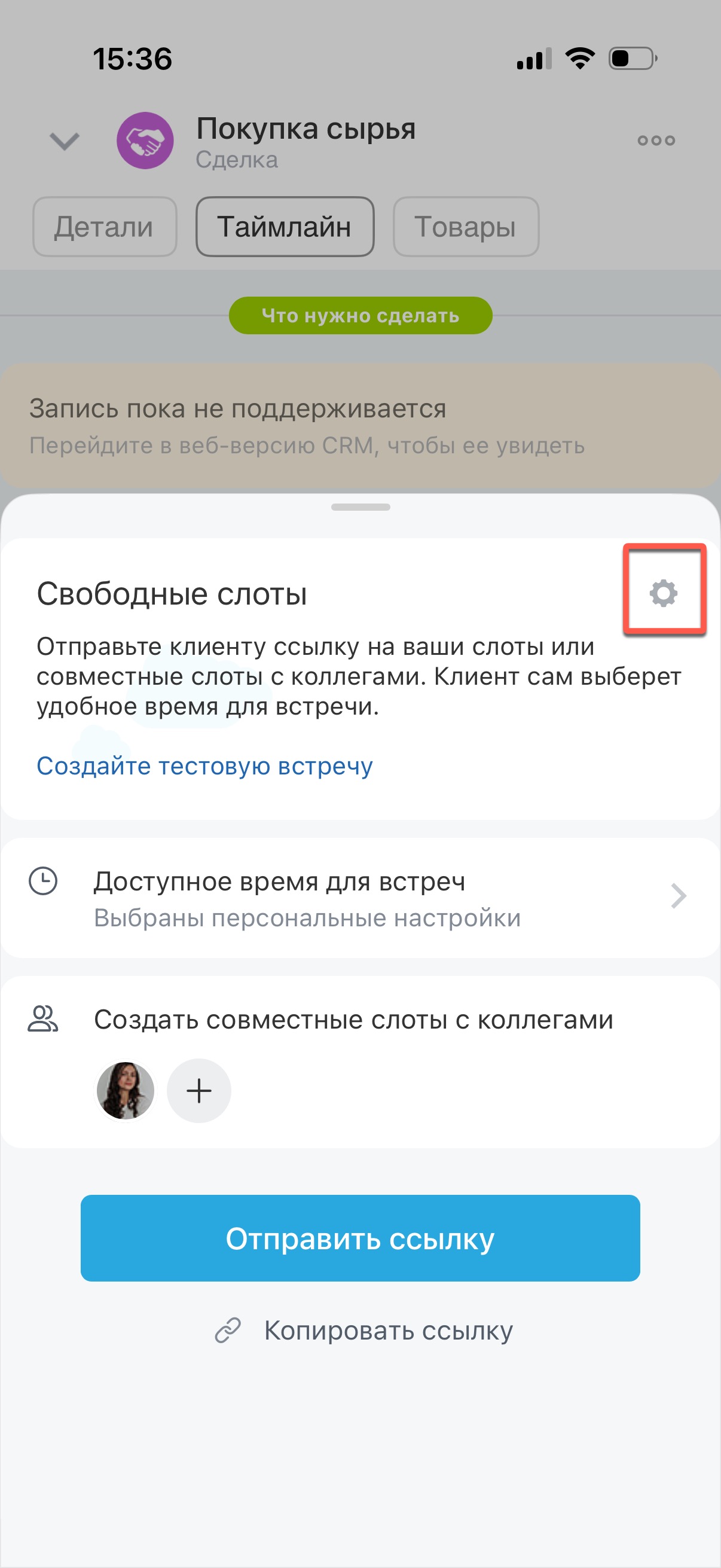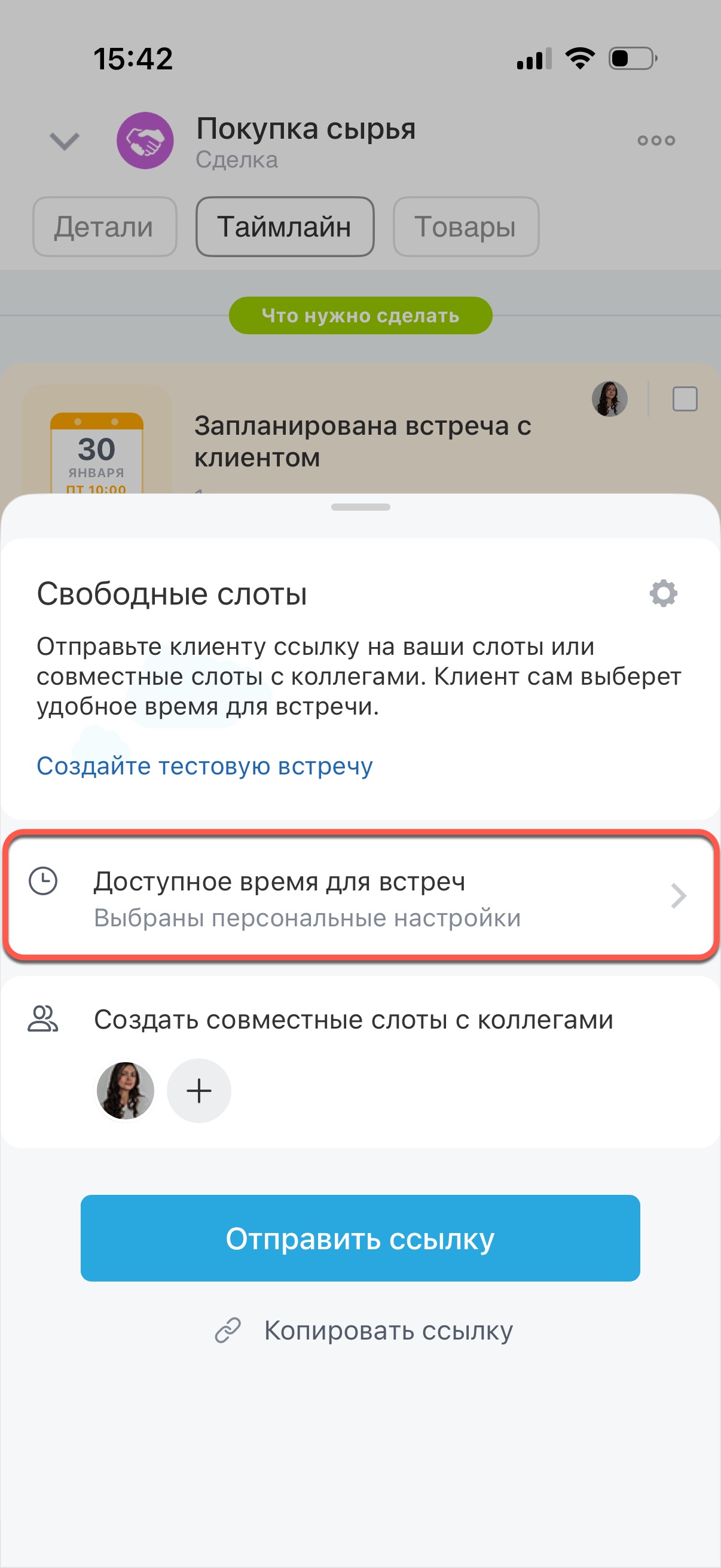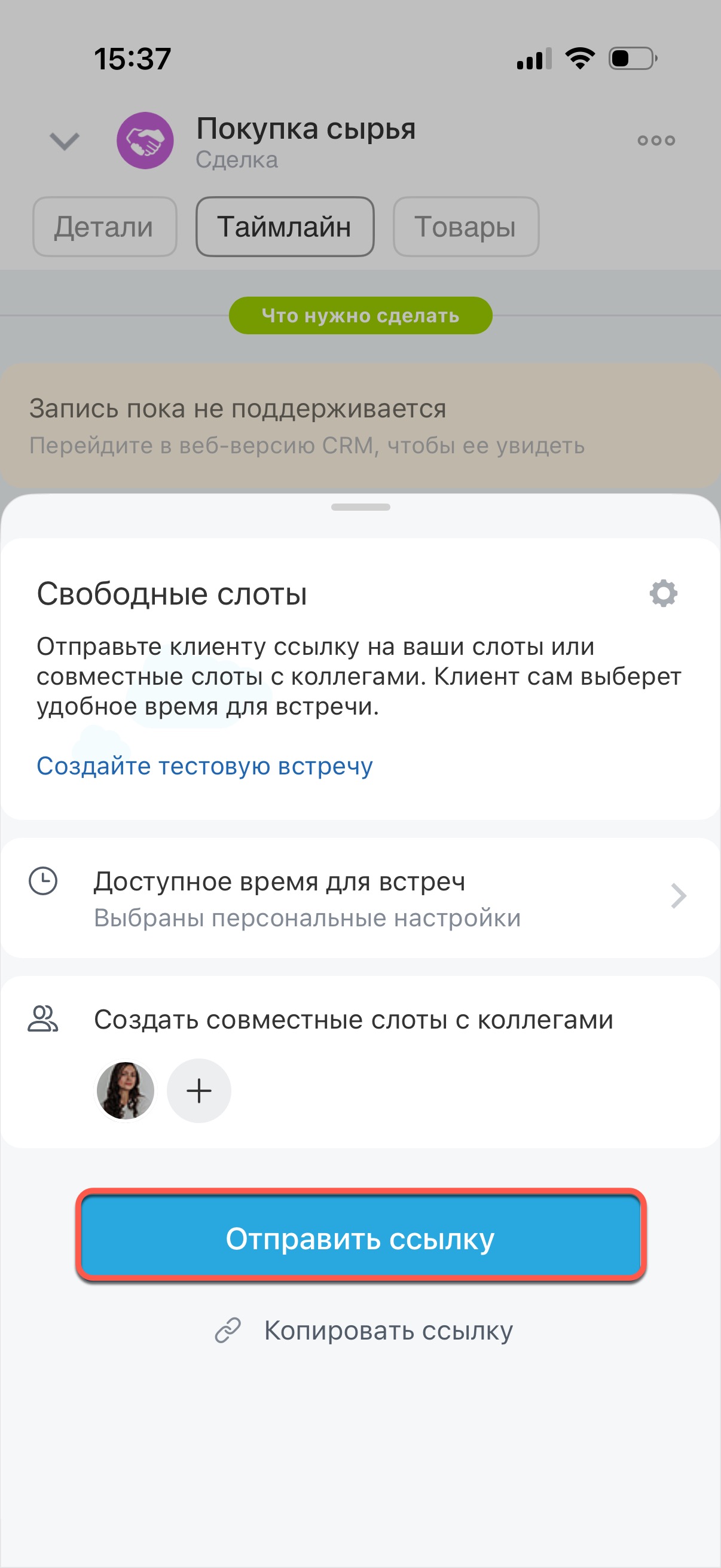 Вернитесь на страницу слотов и нажмите Отправить ссылку. Все дальнейшие шаги клиента будут показаны в таймлайне сделки.