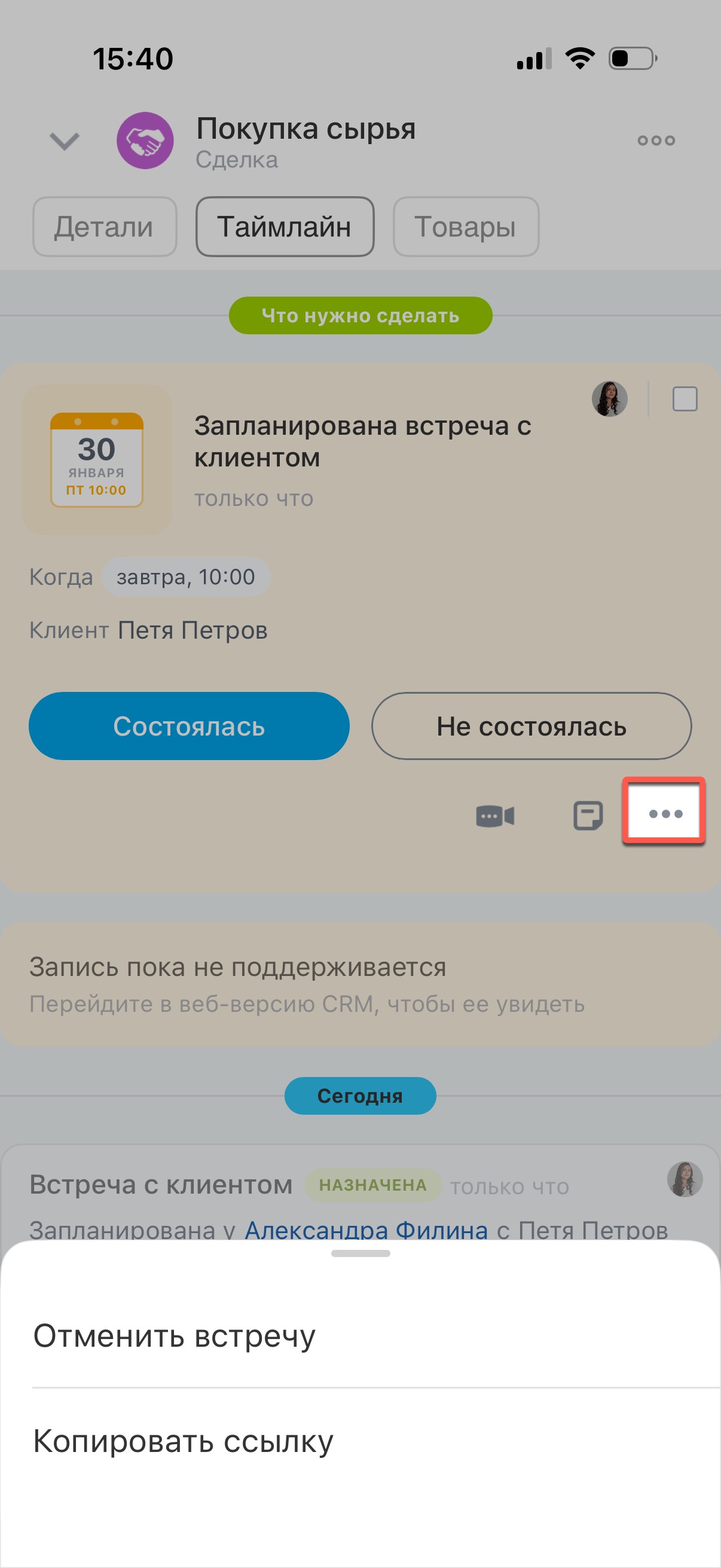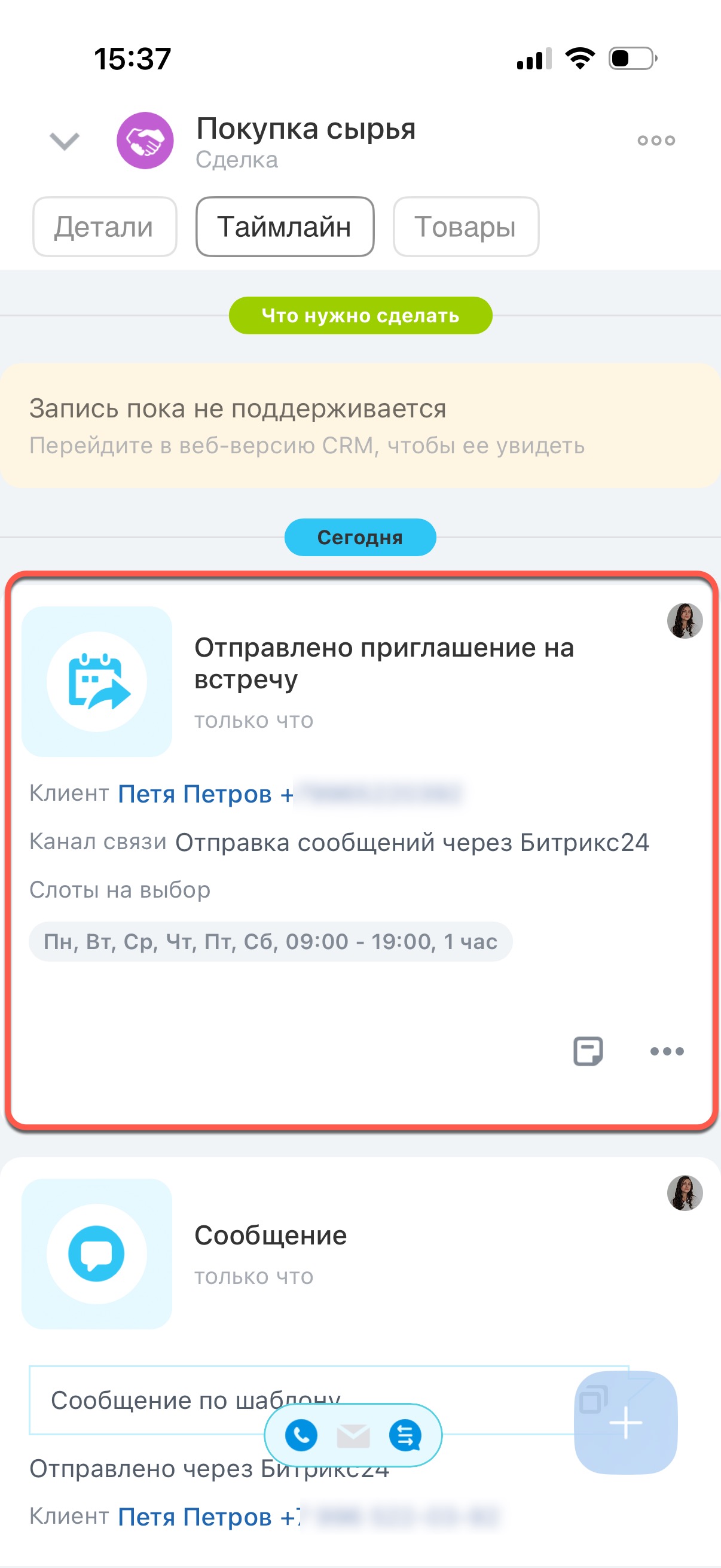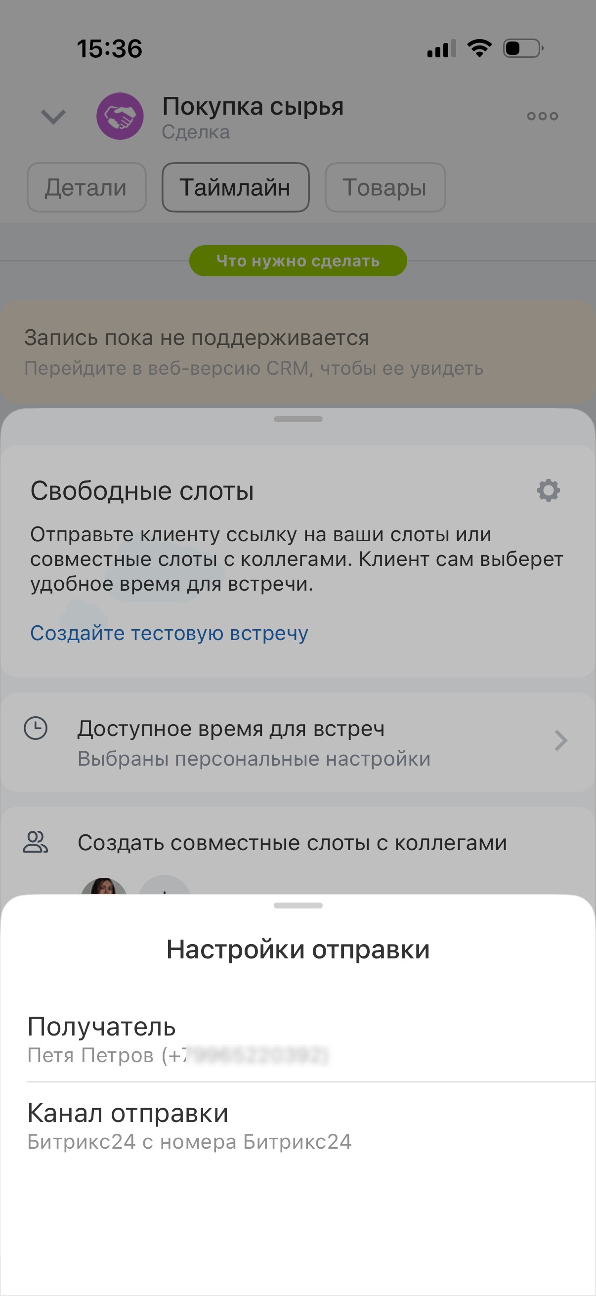 Вернитесь на страницу слотов и нажмите Отправить ссылку. Все дальнейшие шаги клиента будут показаны в таймлайне сделки.