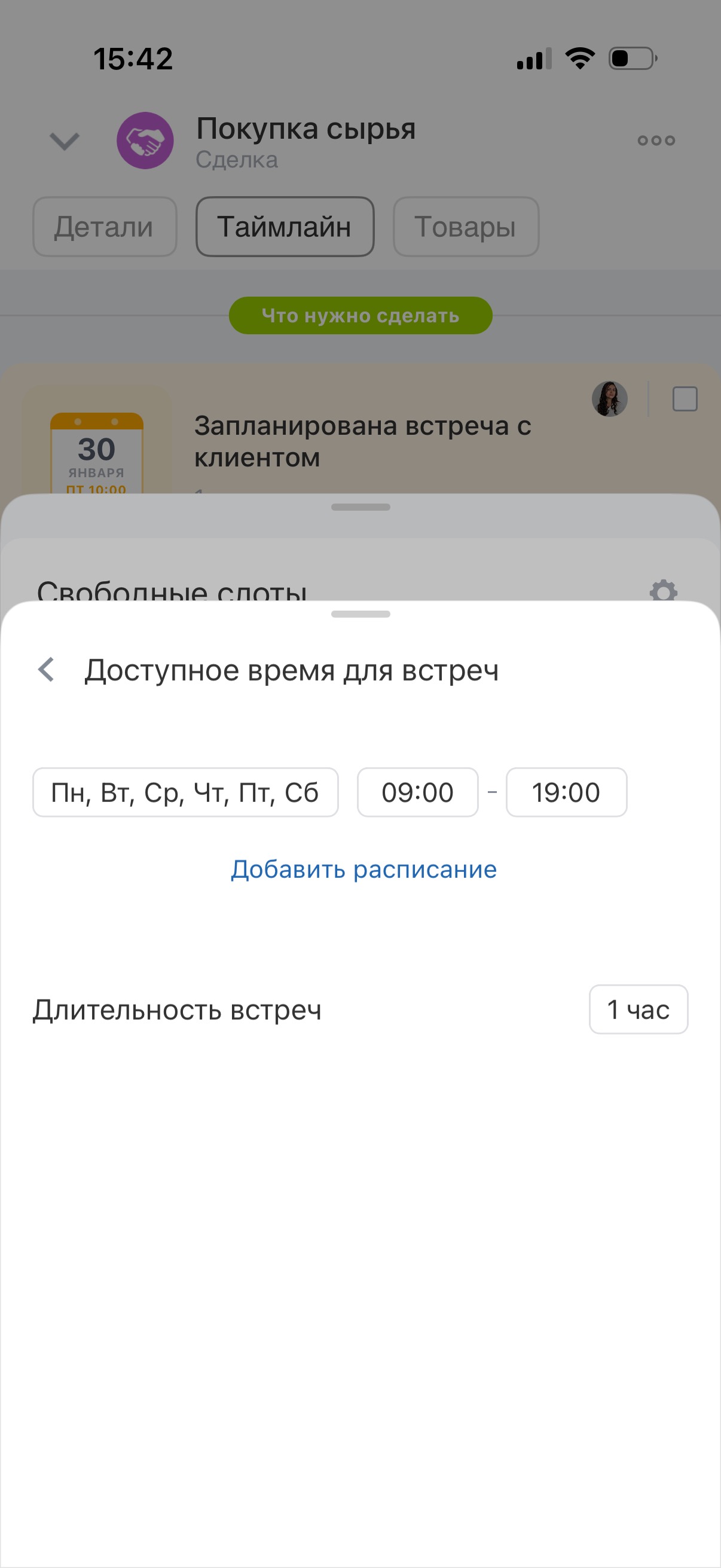 Слоты — это промежутки времени в расписании, которые выделены для событий и встреч. Поделитесь с клиентом расписанием своего календаря, и он сам сможет выбрать день и время для встречи. Клиент увидит только свободные слоты календаря. Доступа к событиям вашего календаря и их описаниям у него не будет.