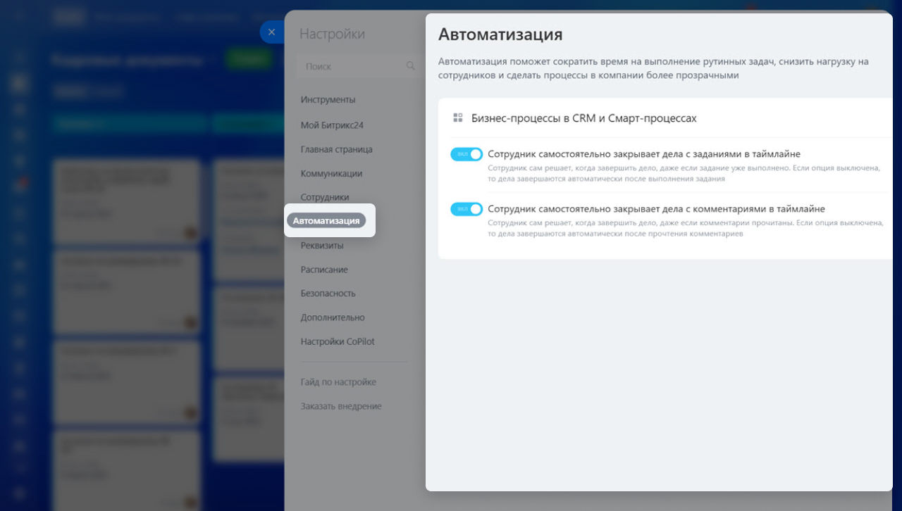 В разделе Автоматизация можно выбрать, как в карточке CRM закрывать дела с комментариями и заданиями бизнес-процессов — вручную или автоматически.