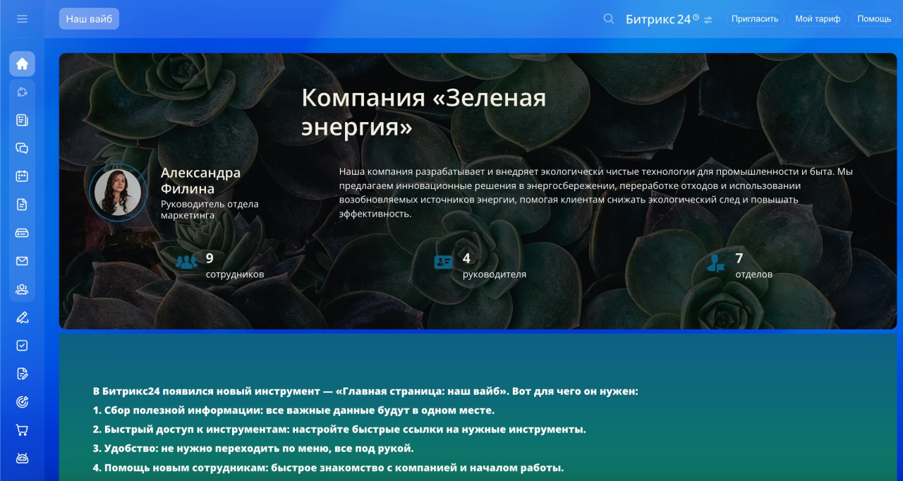 Главная страница: наш вайб — это первая страница Битрикс24, которую сотрудники увидят при входе. Здесь можно собрать полезную информацию и настроить быстрый доступ к инструментам. Все важное и нужное в одном месте, без переходов в меню. Новым сотрудникам главная страница поможет быстрее познакомиться с компанией и начать работу.