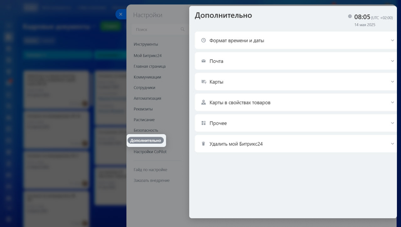 В разделе Дополнительно вы можете:- Устанавливать формат времени и даты в вашем Битрикс24.