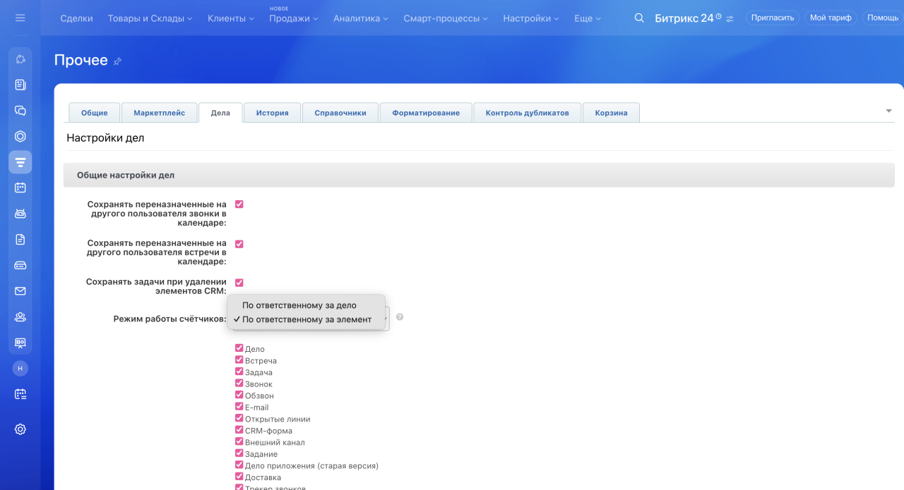 В CRM есть два режима работы счетчиков: Ответственный за элемент и Ответственный за дело.