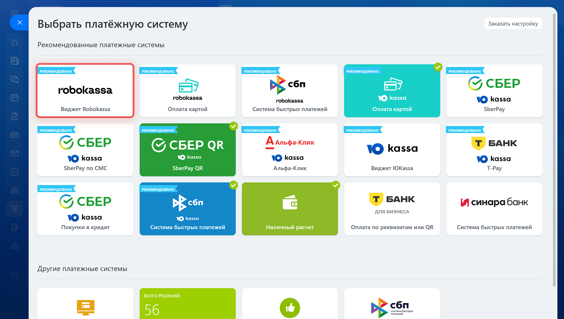 - Подключите Робочеки в разделе CRM > Продажи > Управление продажами > Центр продаж > Платежные системы > Robokassa.