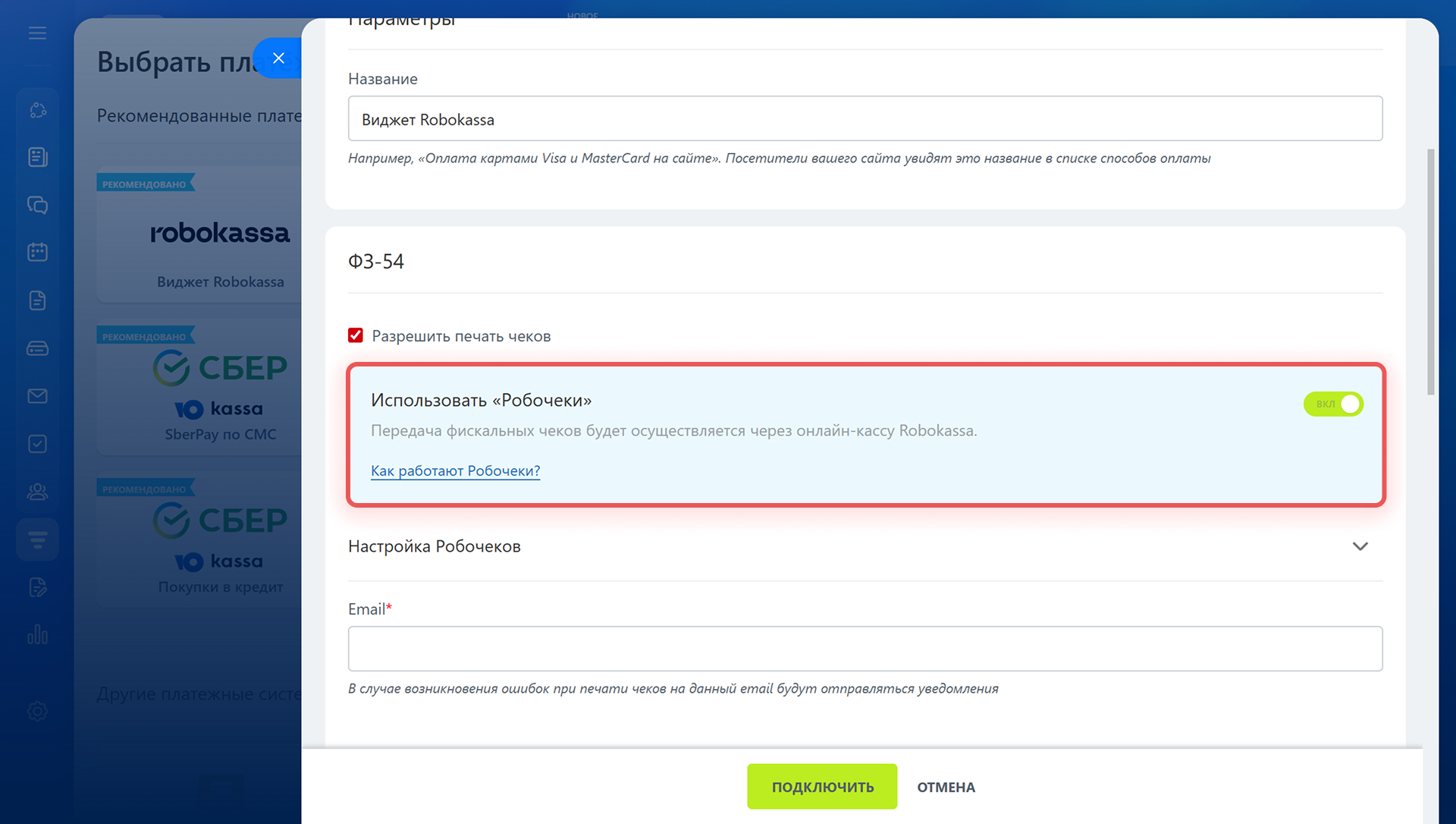 Включите опцию «Использовать Робочеки». Введите email, на который будут приходить уведомления, если при печати чеков возникнут ошибки.