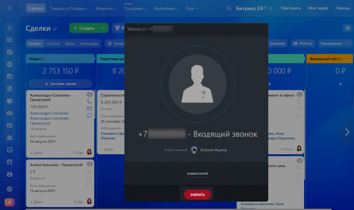 Если лид создан автоматически или звонок поступил от известного клиента, нажмите Открыть CRM, чтобы открыть карточку клиента или создать сделку.
