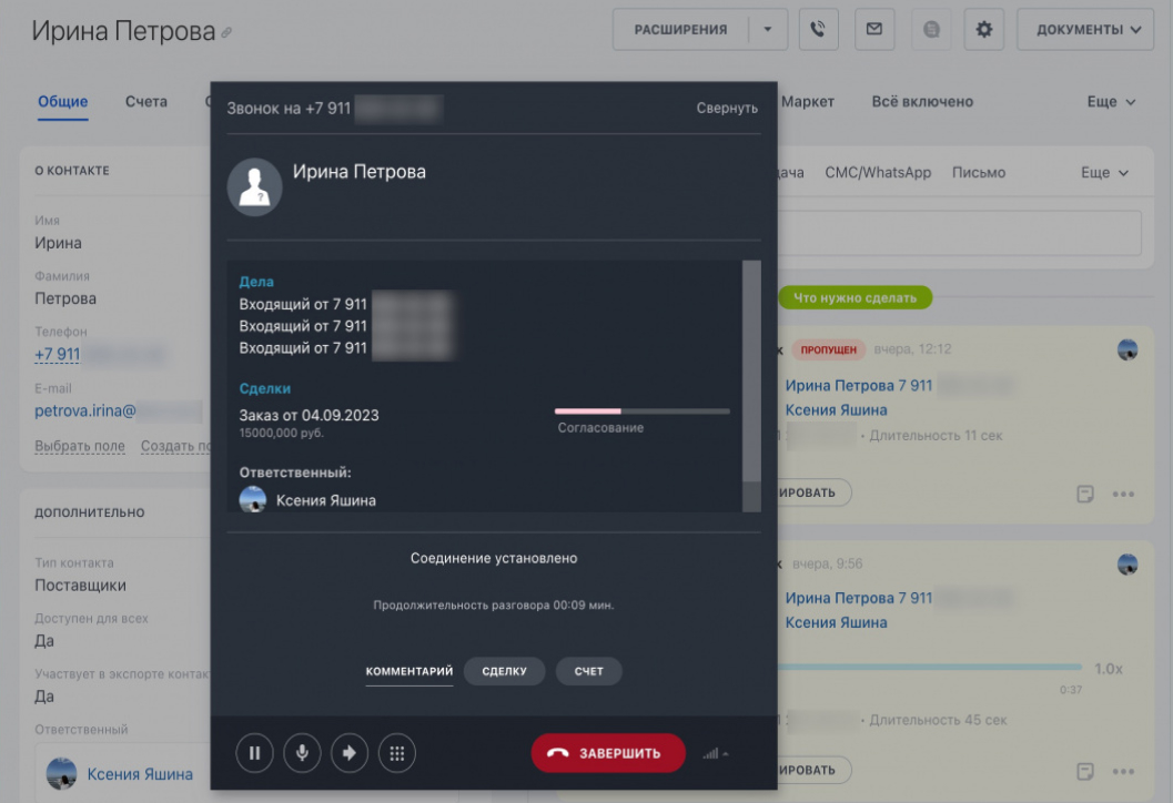 - Карточка звонка появляется автоматически при входящих и исходящих вызовах.