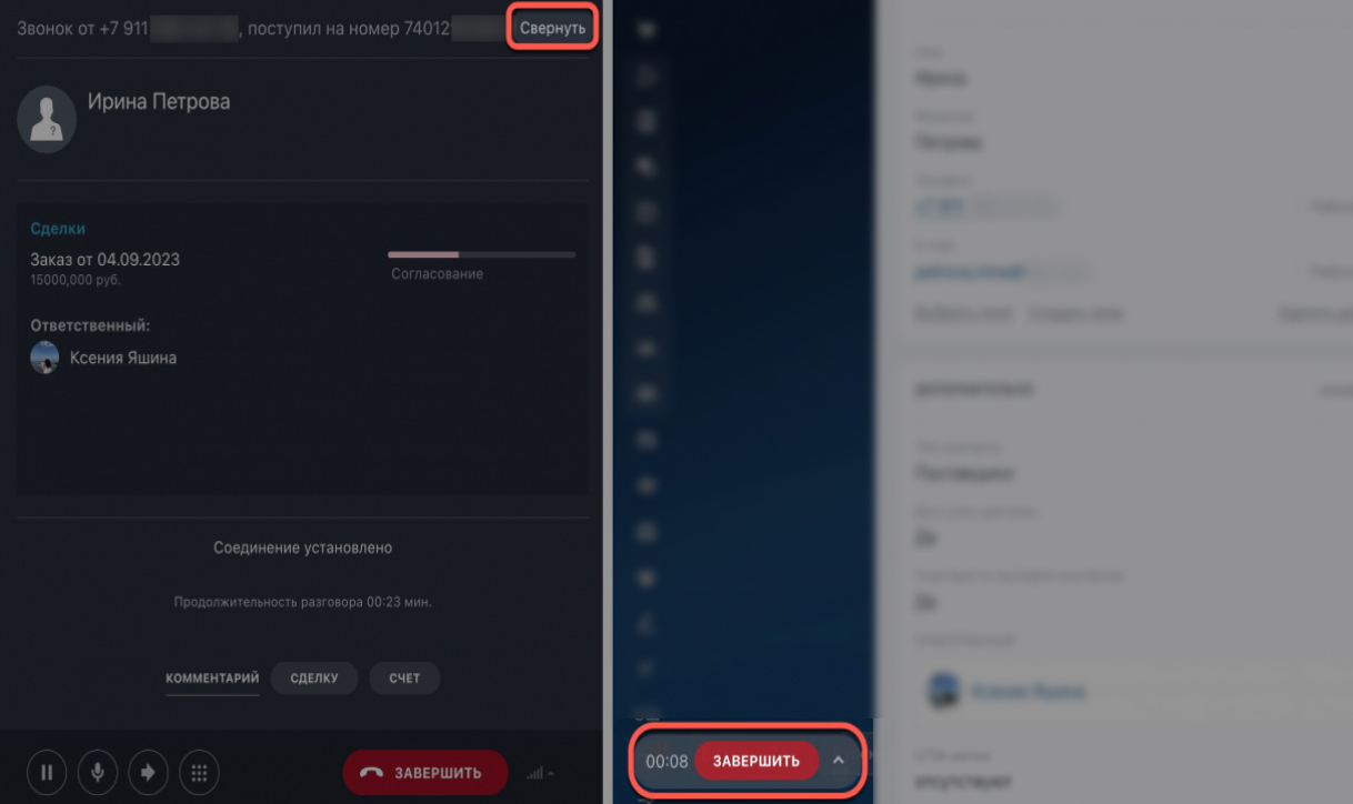 Чтобы работать на портале, пока общаетесь с клиентом, скройте карточку звонка, нажав Свернуть. Чтобы развернуть карточку, нажмите кнопку (^).