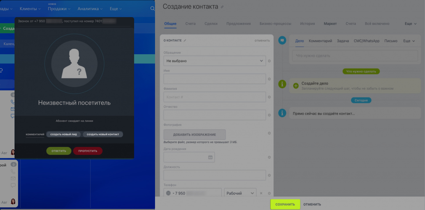Если выбрано ручное создание лида, звонок от нового клиента не будет автоматически сохранен в CRM. Нажмите Создать новый лид или Создать новый контакт. На отдельной странице откроется карточка создания элемента — заполните поля и сохраните изменения.