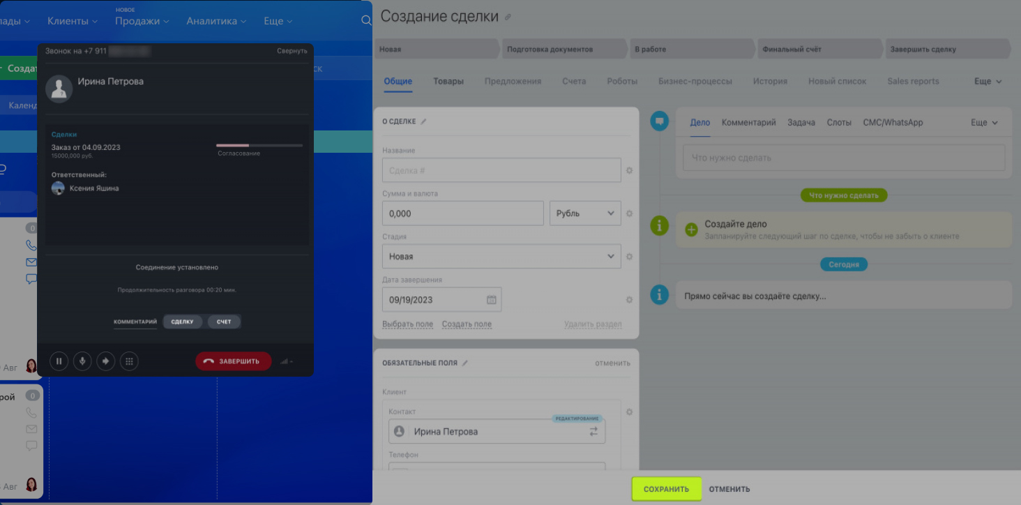 Если выбрано автоматическое создание лида, при звонке будет создан новый лид. Если клиент уже сохранен в CRM, в карточке звонка будут указаны связанные с ним элементы CRM. Нажмите Сделку или Счет, чтобы создать новый элемент, заполните поля и сохраните карточку.
