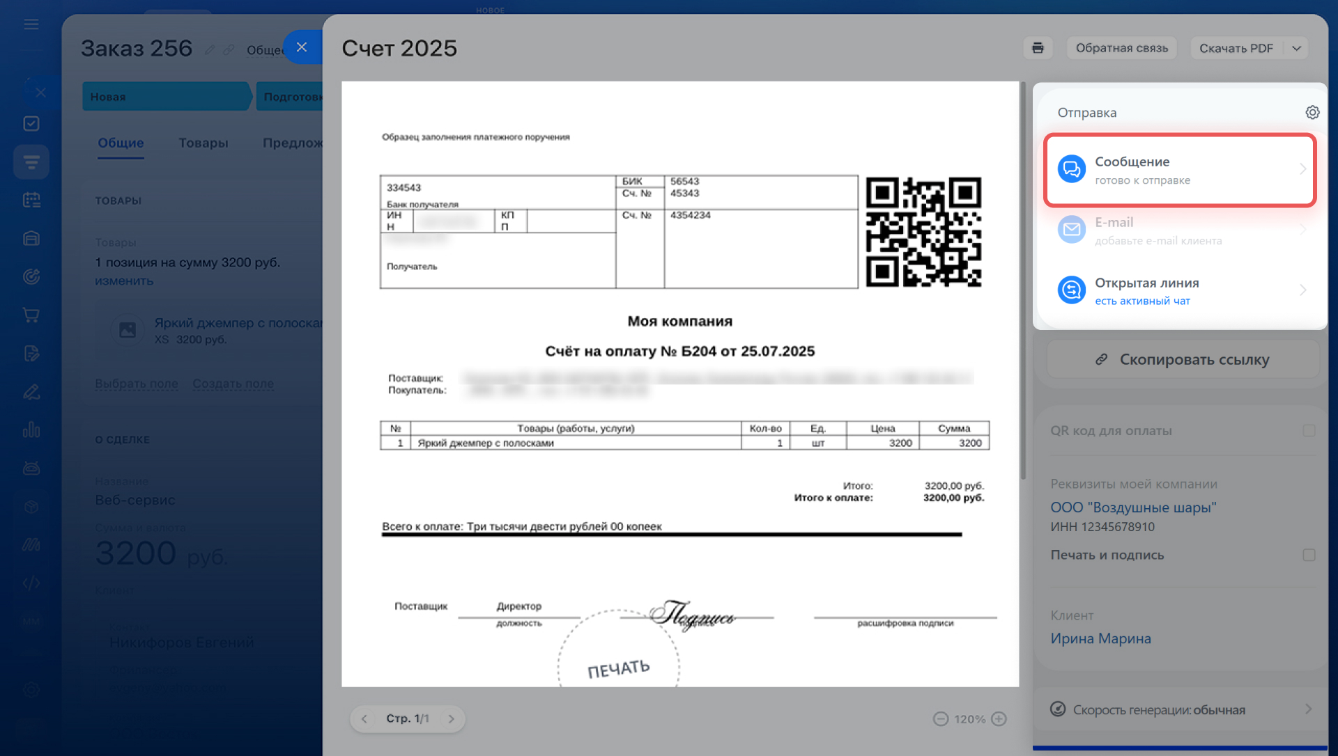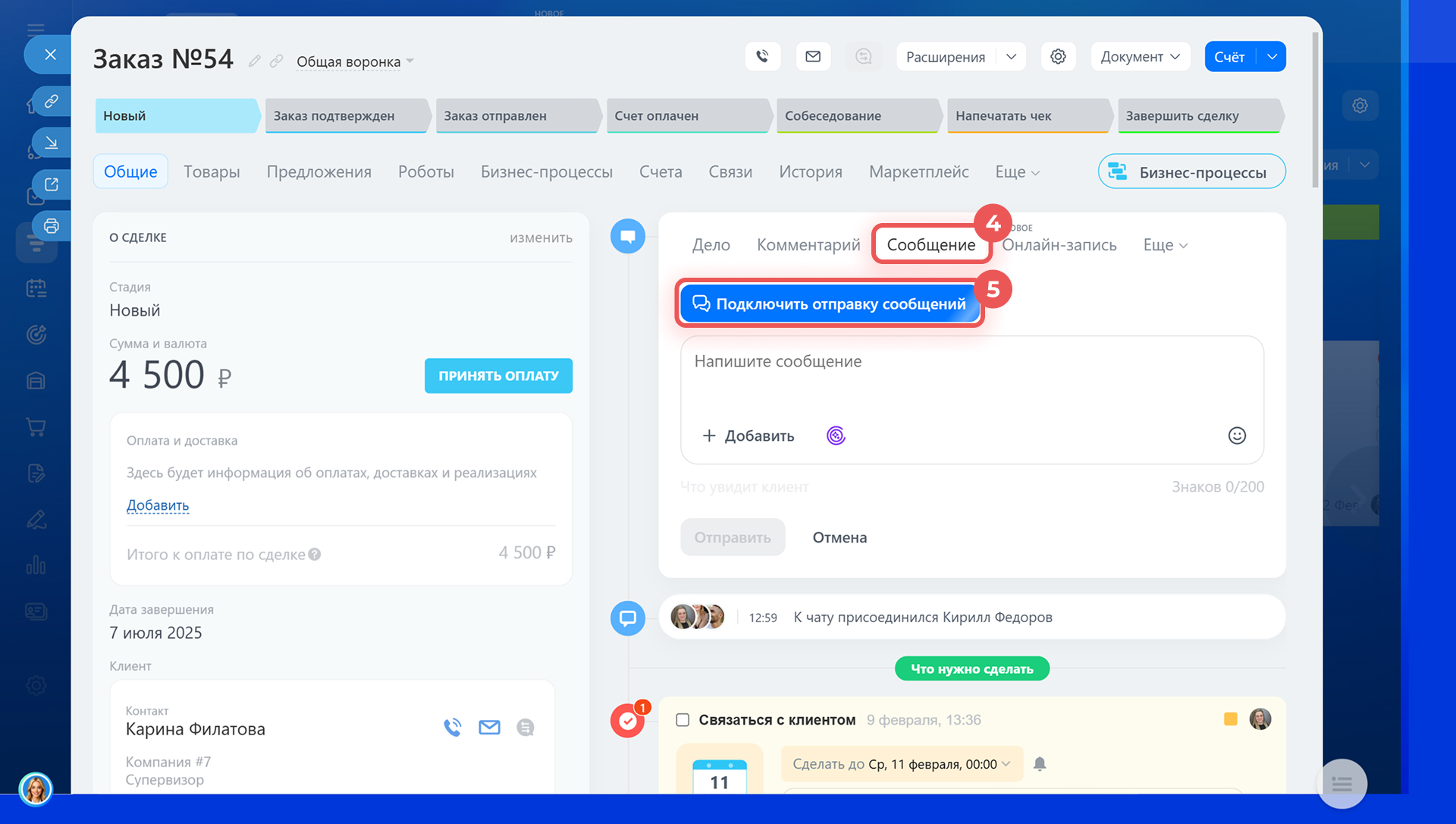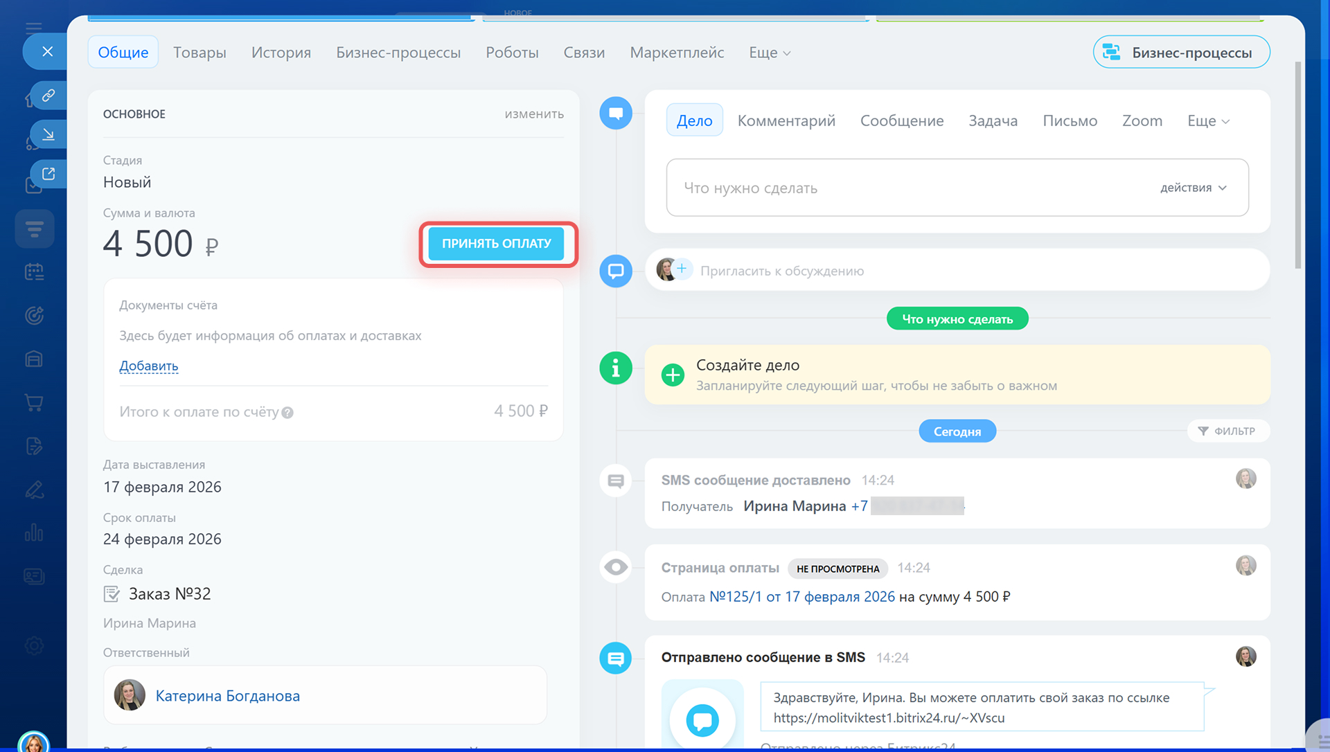 Отправить ссылку на оплату — создать ее можно в карточке сделки.